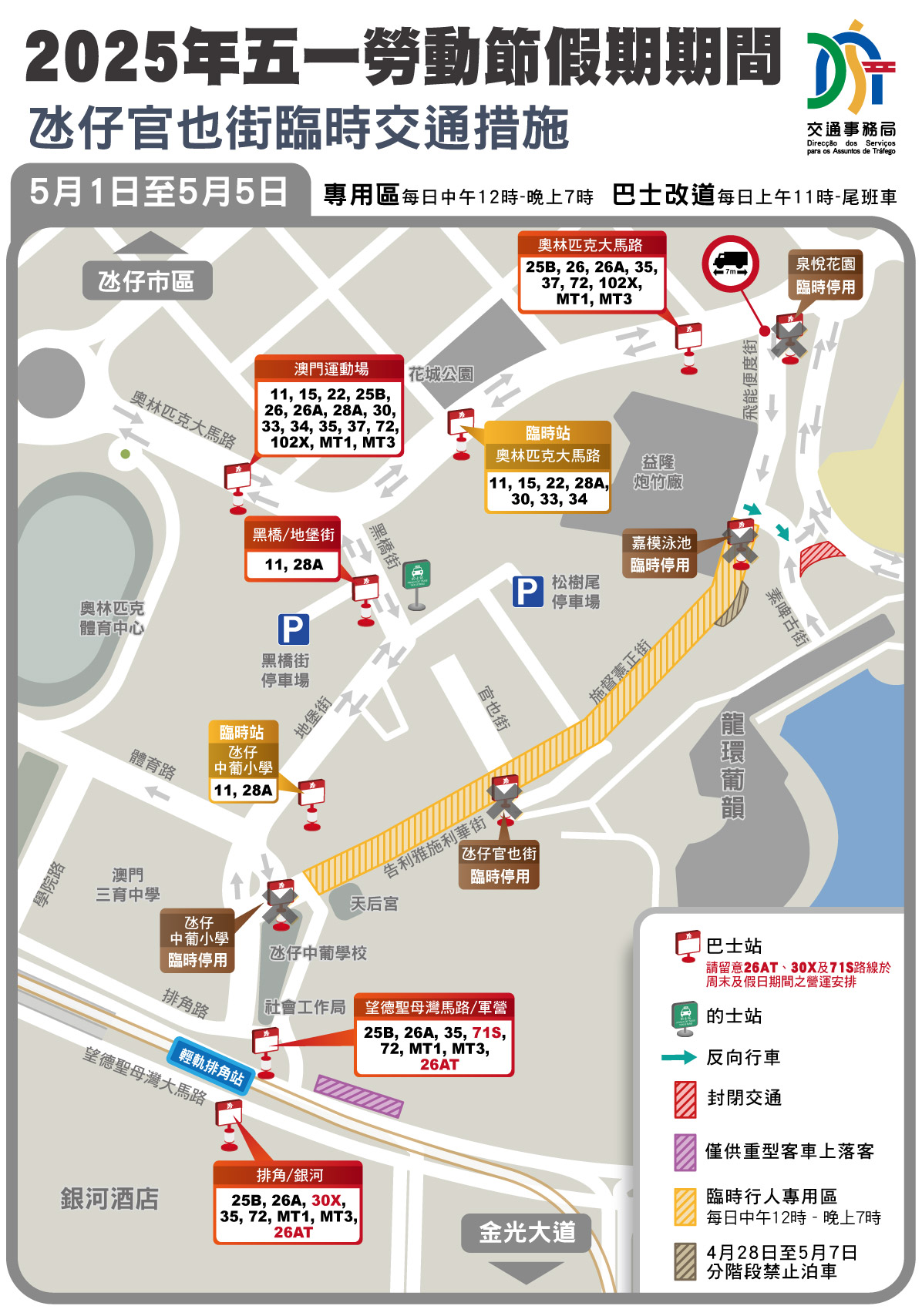 巴士方面,关闸广场东侧、新马路及周边区域、氹仔旧城区参考过往节假日分流方案实施临时措施;两间巴士公司因应假日增加服务班次,并于5月1至5日营运时节性路线3BX、17T、21AT、26AT及101X特班车(101XS)路线,以加快疏导乘客;配合有关安排,周边道路需实施临时交通管制措施。上述相关巴士路线临时调整详情,可参阅附表或浏览两巴网站(澳巴:www.tcm.com.mo、新福利:www.transmac.com.mo)。