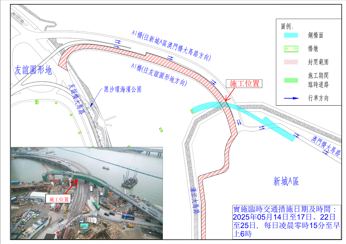 A1桥往新城A区澳门桥大马路方向行车路线不变;A1桥往友谊圆形地方向实施封闭交通,由新城A区前往黑沙环区之车辆,仅可经濠江大马路取道A2桥前往马揸度博士大马路。