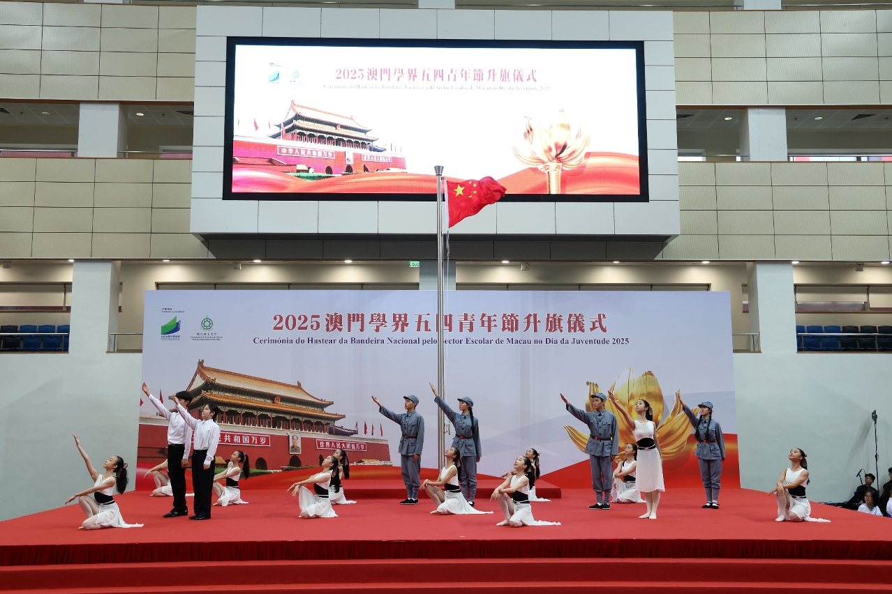 在澳门青年管乐团的洪亮演奏,伴随着培正中学、嘉诺撒圣心英文中学、菜农子弟学校、澳门浸信中学、高美士中葡中学学生组成的合唱团带领下,全体人员高唱中华人民共和国国歌,五星红旗在澳门学界升旗队旗手的拉动下缓缓升起,气氛庄严。接着,澳门演艺学院与中葡职业技术学校合作的表演艺术班学生精心编排演绎《冼星海与黄河颂》,藉多元艺术将五四精神融入其中,以热情传递爱国情怀,以才华展现青春风采;澳门中华总商会附设青洲中学学生演出舞蹈《中华之魂》,融入书法、龙舟及武术等中华文化元素,充分展现中华民族的独特魅力与强大力量。