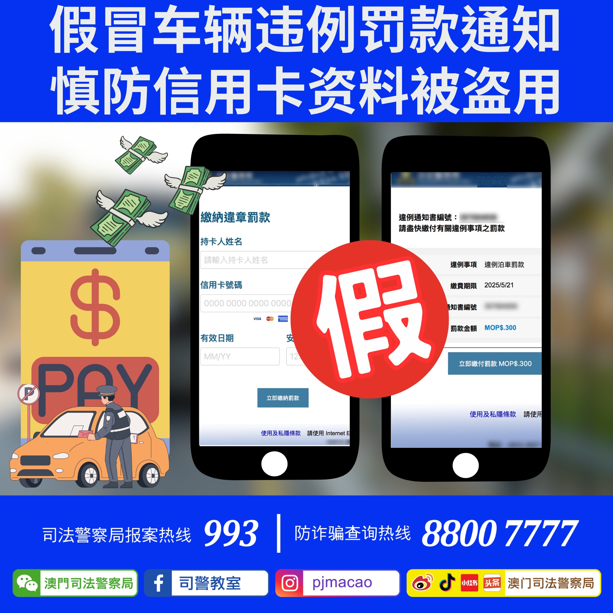 司警局今日发现有骗徒假冒澳门治安警察局向市民滥发手机短讯,内容指市民有交通违例罚款需透过短讯内附带之连结进行缴付,若点击连结将进入到一个假冒「治安警察局交通违例查询及缴费系统」的网页,会讹称有「交通违例」罚款需输入车牌号码及透过信用卡缴费,借此套取市民信用卡资料进行未经授权之消费,造成市民有所损失。