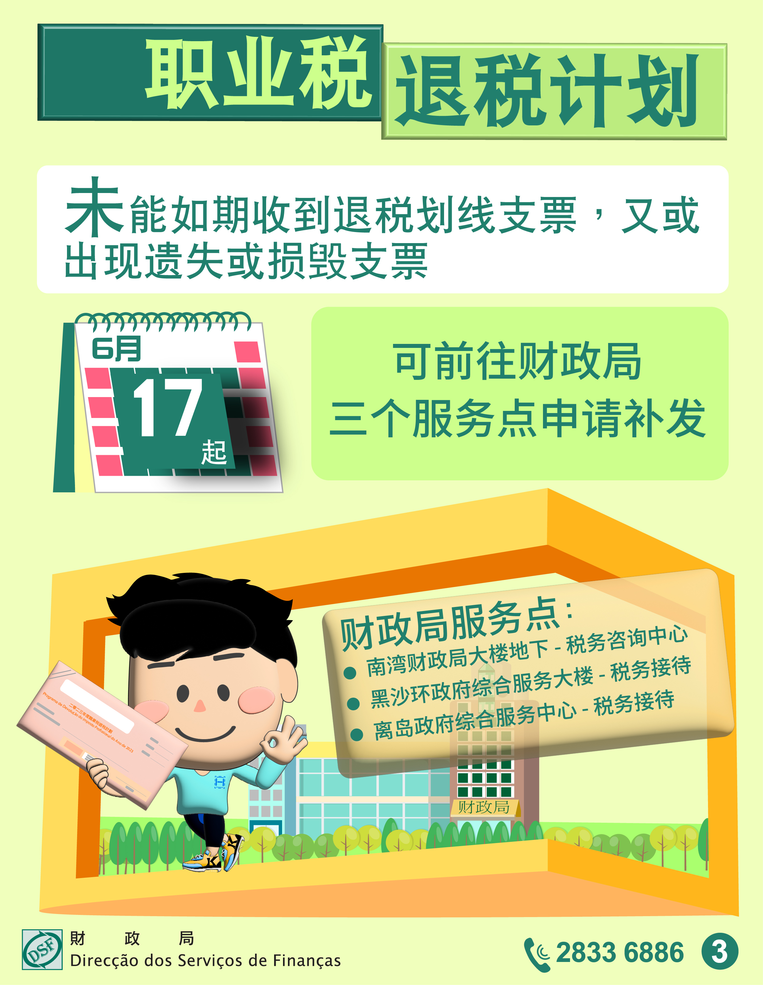 倘纳税人未能如期收到退税划线支票,又或出现遗失或损毁支票等情况,可自6月17日起前往财政局三个服务点申请补发支票。