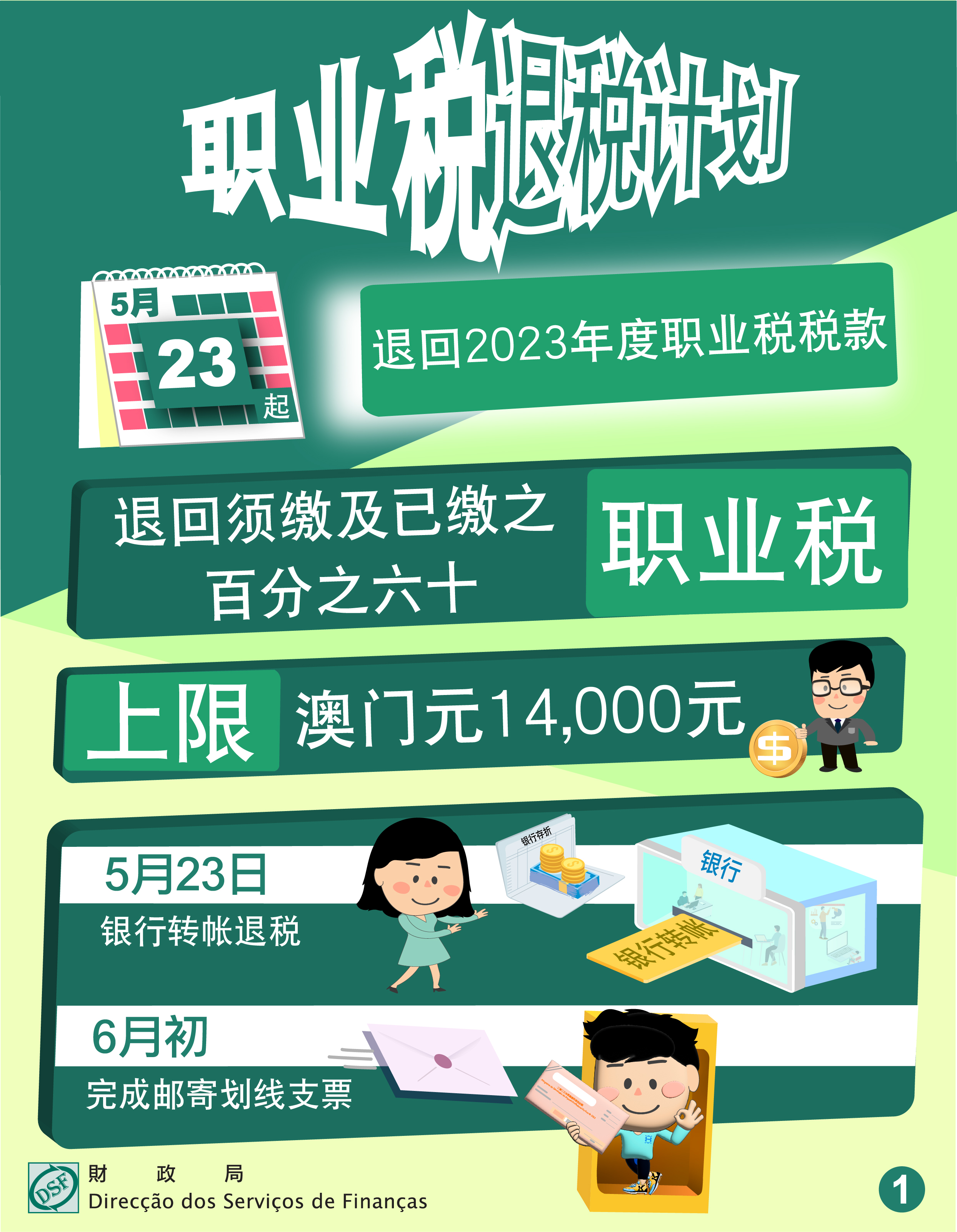 根据第25/2024号法律《2025年财政年度预算案》第二十条的规定,财政局自5月23日起有序向2023年12月31日持有澳门居民身份证的约16.5万名职业税纳税人,退还2023年度须缴并已缴纳的职业税税款百分之六十,上限为澳门元14,000元,涉及退税总金额约澳门元9.8亿元。