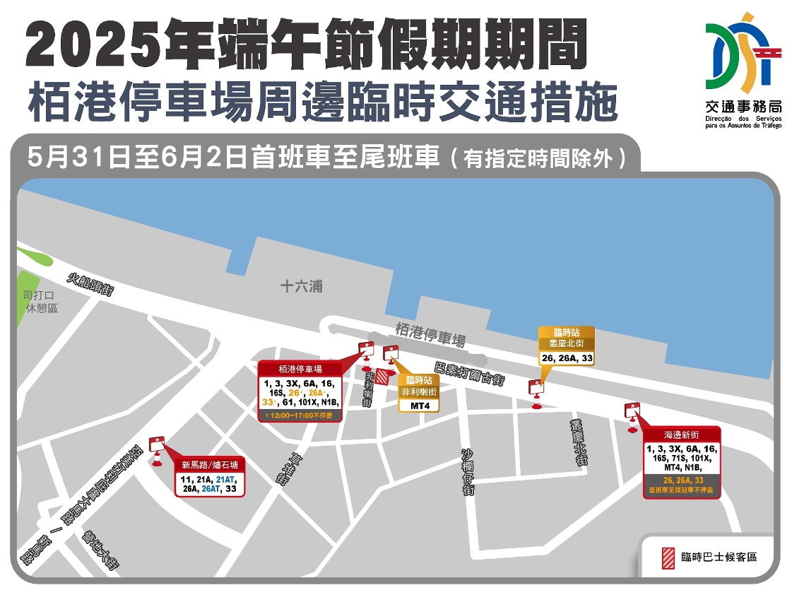 为应对端午节期间居民及访澳旅客的出行需求,交通事务局联同治安警察局、海关、巴士公司、博企、酒店及陆路跨境客运公司等举行会议,制订多项临时交通措施,重点优化口岸、旅游区及繁忙路段的交通疏导方案,保障节假日出行安全顺畅。