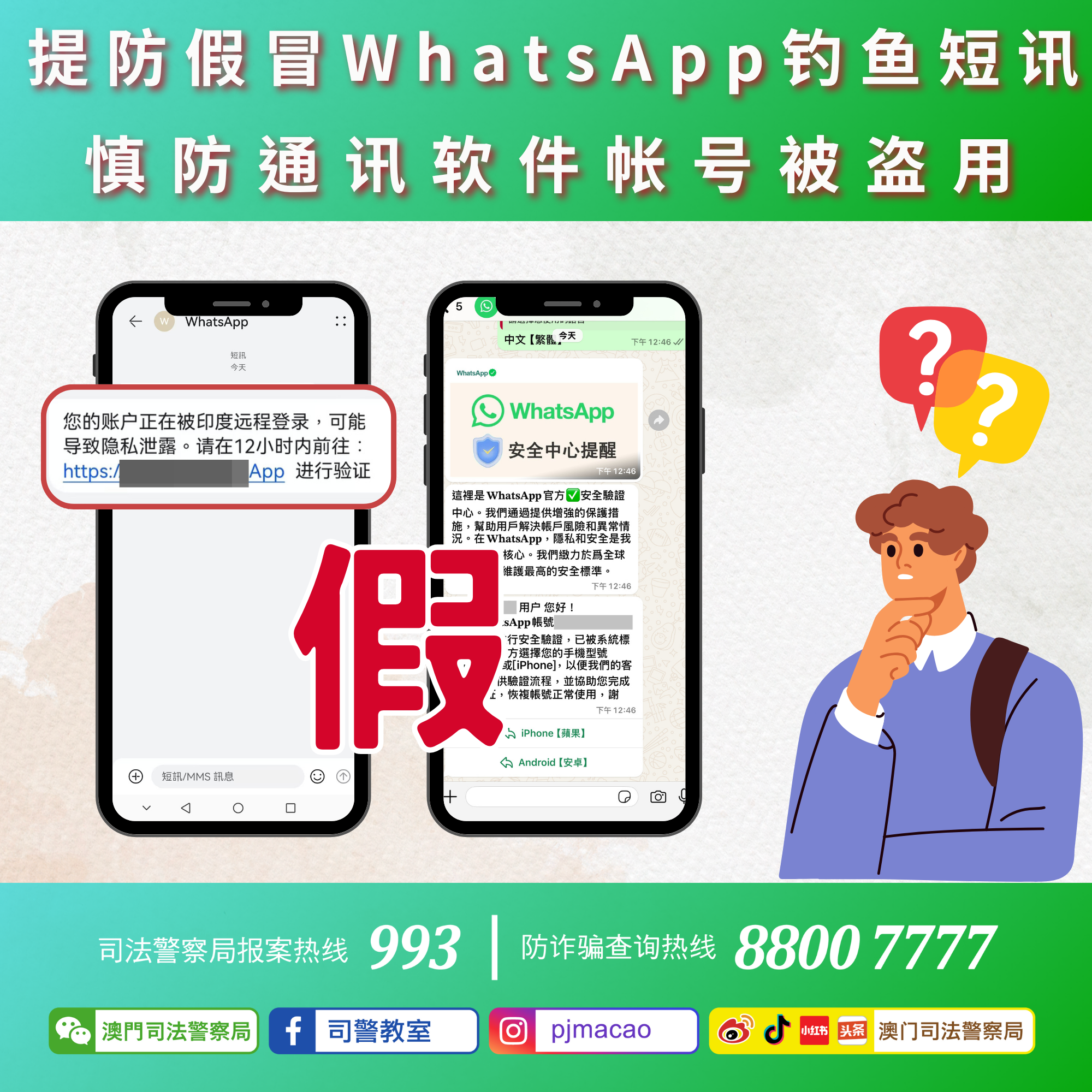 4. 如有怀疑,可使用司警局“反诈程式”查询风险指数或上报资料,又或致电司警局防诈骗查询热线 88007777 及报案热线 993 求助。
