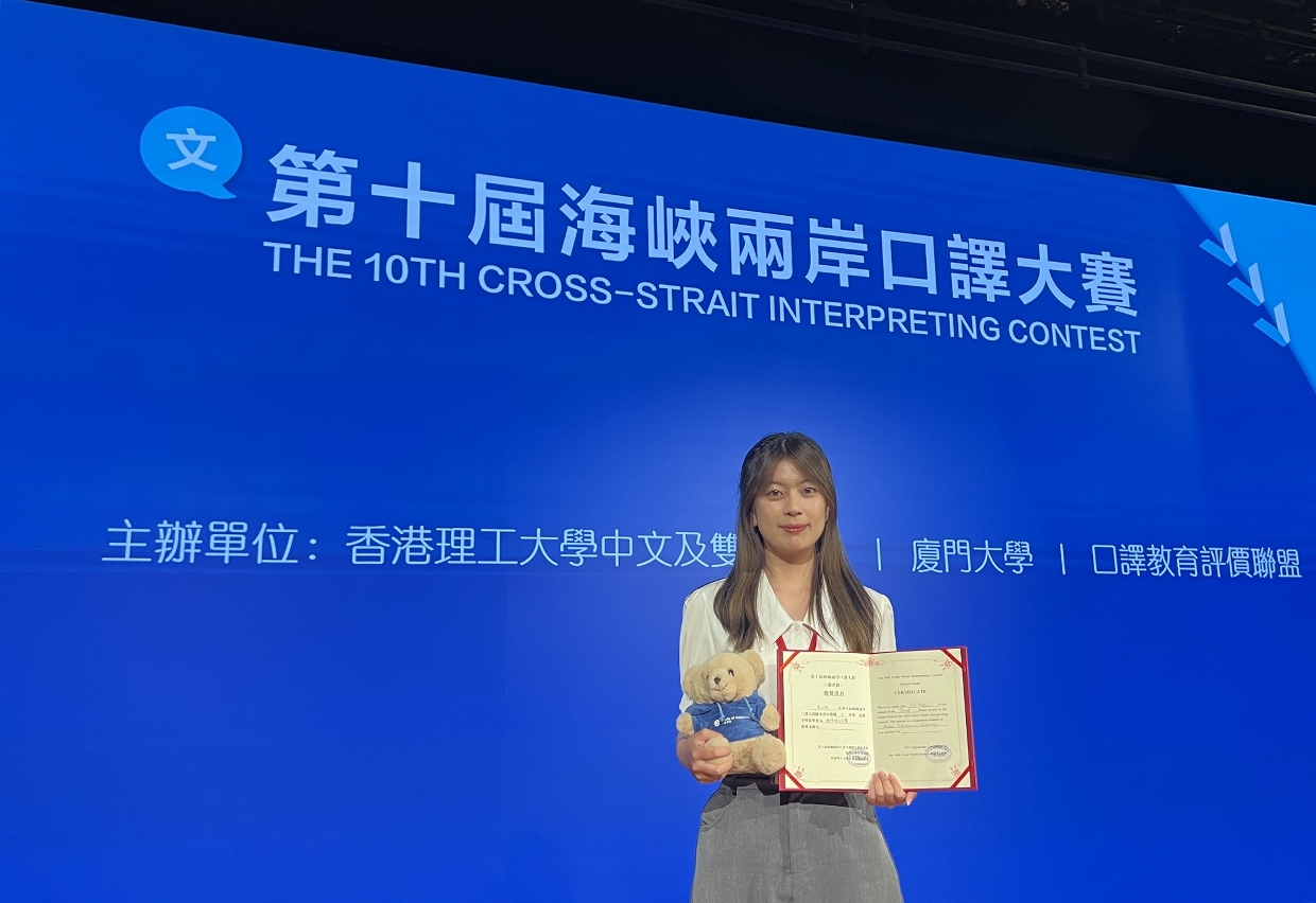 第十届海峡两岸口译大赛总决赛于香港理工大学举行,澳门理工大学语言及翻译学院中英翻译学士学位课程学生李心怡,凭藉其扎实的双语功底、敏捷的思维及稳定发挥,从来自世界各地的顶尖高校选手中脱颖而出,代表澳门荣获全国三等奖,同时获澳门赛区二等奖。