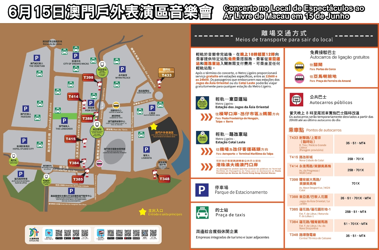 局方呼吁公众提前浏览交通事务局网页(www.dsat.gov.mo)了解演出当天各项临时交通安排资料,并透过“澳门出行”手机应用程式、交通事务局微信公众号(macaudsat、macau-dsat)留意最新交通消息;有关巴士及轻轨服务详情,请留意两巴网站(澳巴:www.tcm.com.mo、新福利:www.transmac.com.mo)及轻轨公司网页(https://www.mlm.com.mo)。