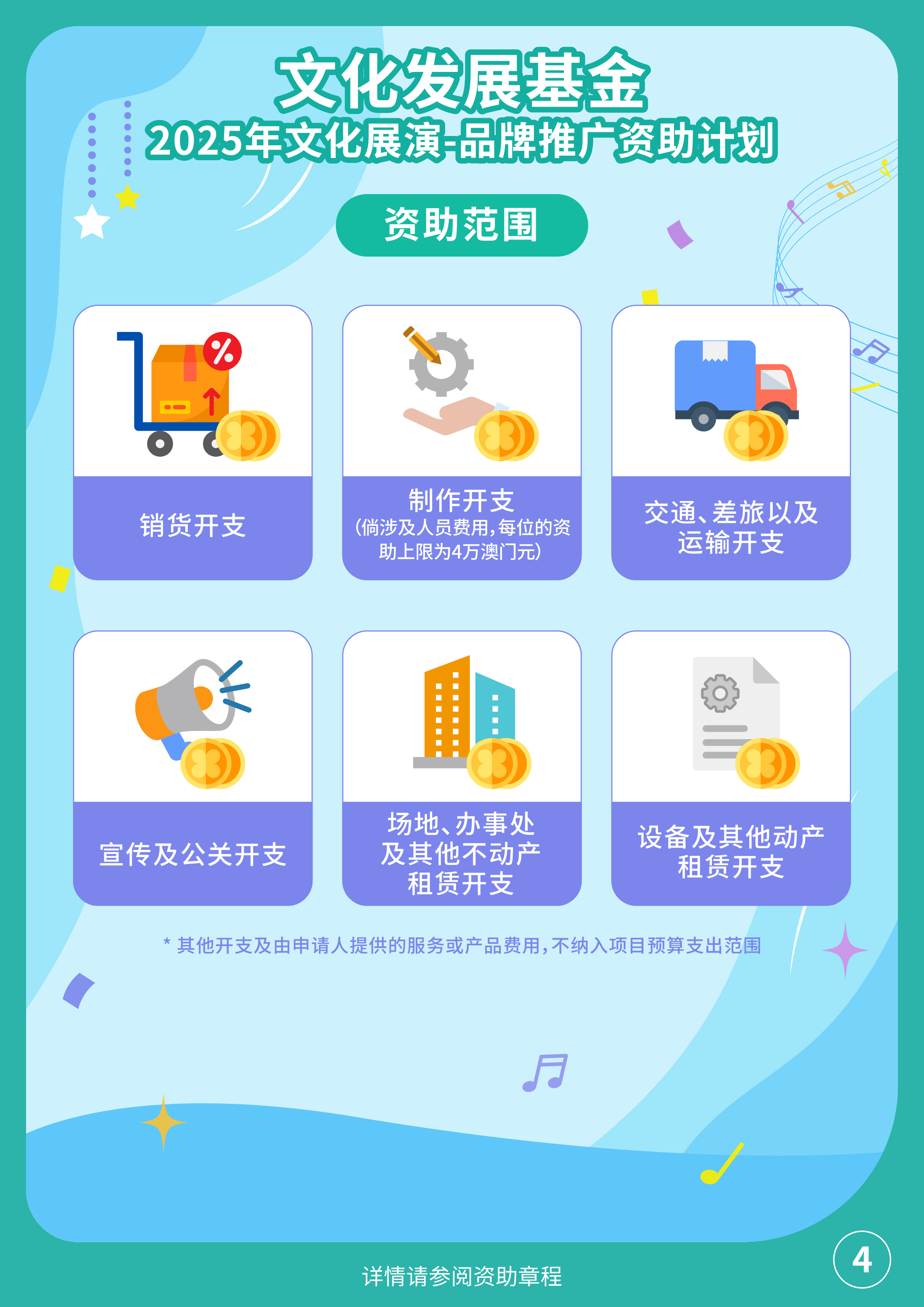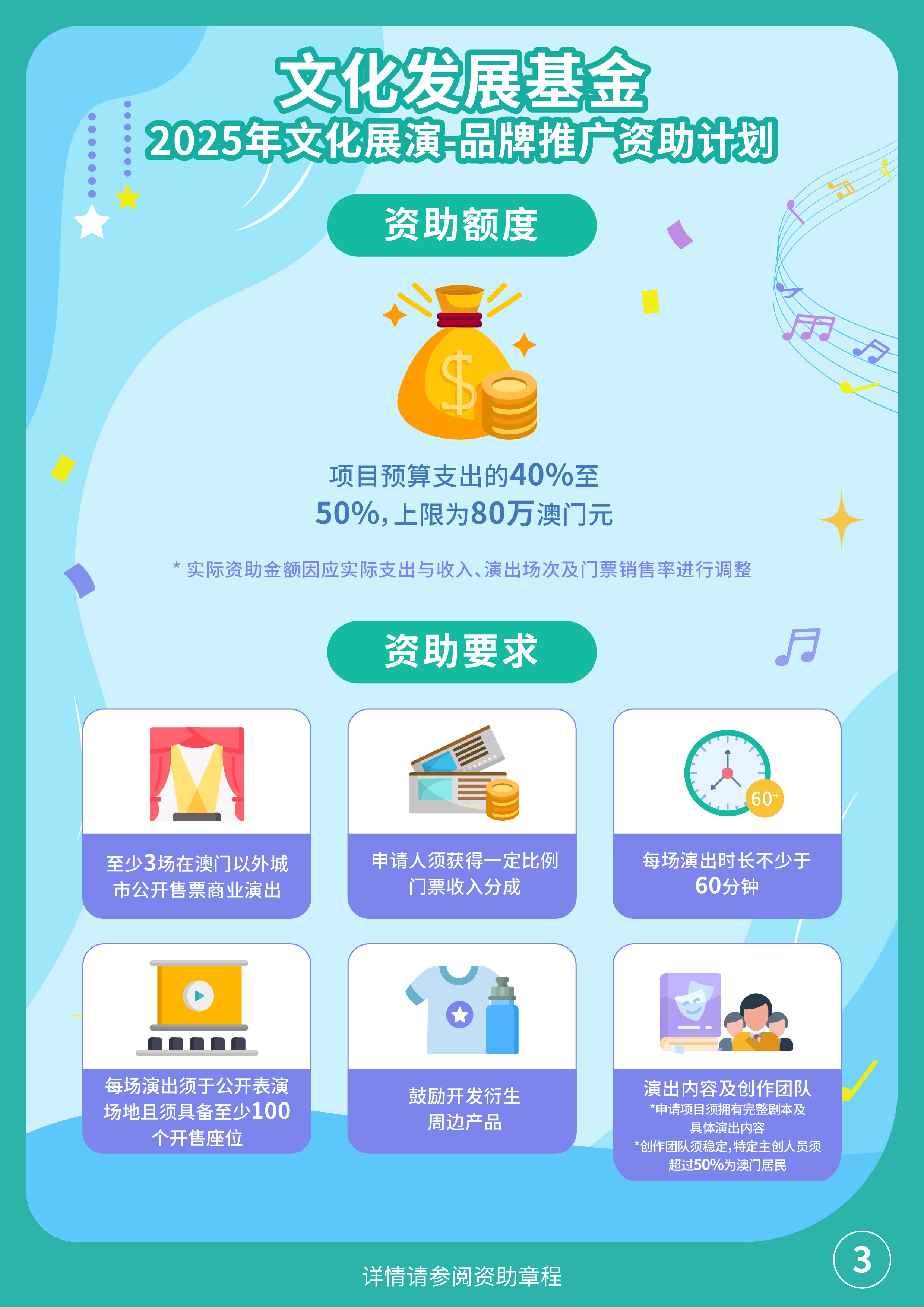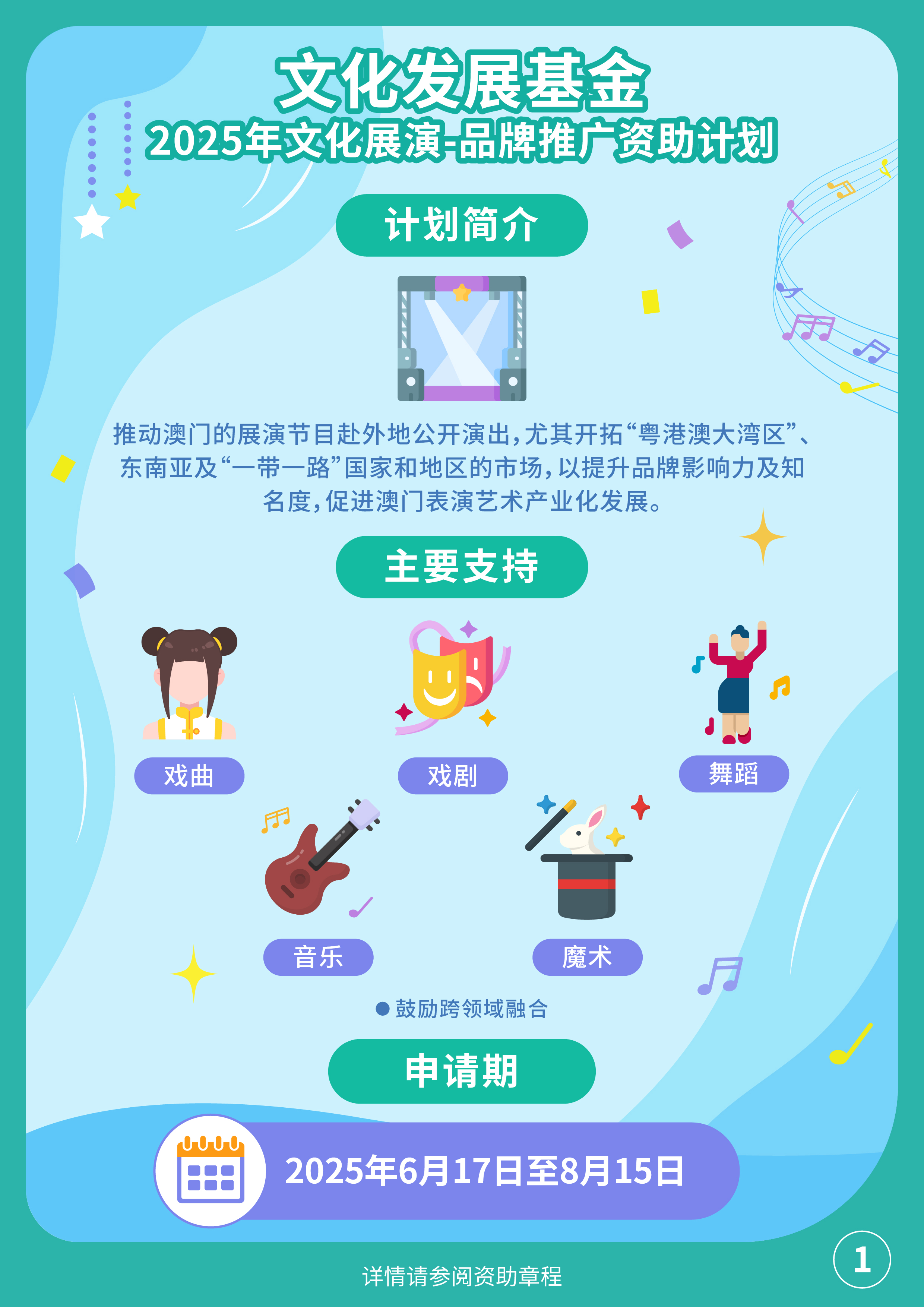 资助计划申请期为6月17日至8月15日,主要支持戏曲、戏剧、舞蹈、音乐、魔术等舞台表演内容,并鼓励跨领域融合的演出项目。申请人须为澳门特区自然人商业企业主或法人商业企业主,并持有演出内容及倘有衍生产品的著作权或获许可使用权。