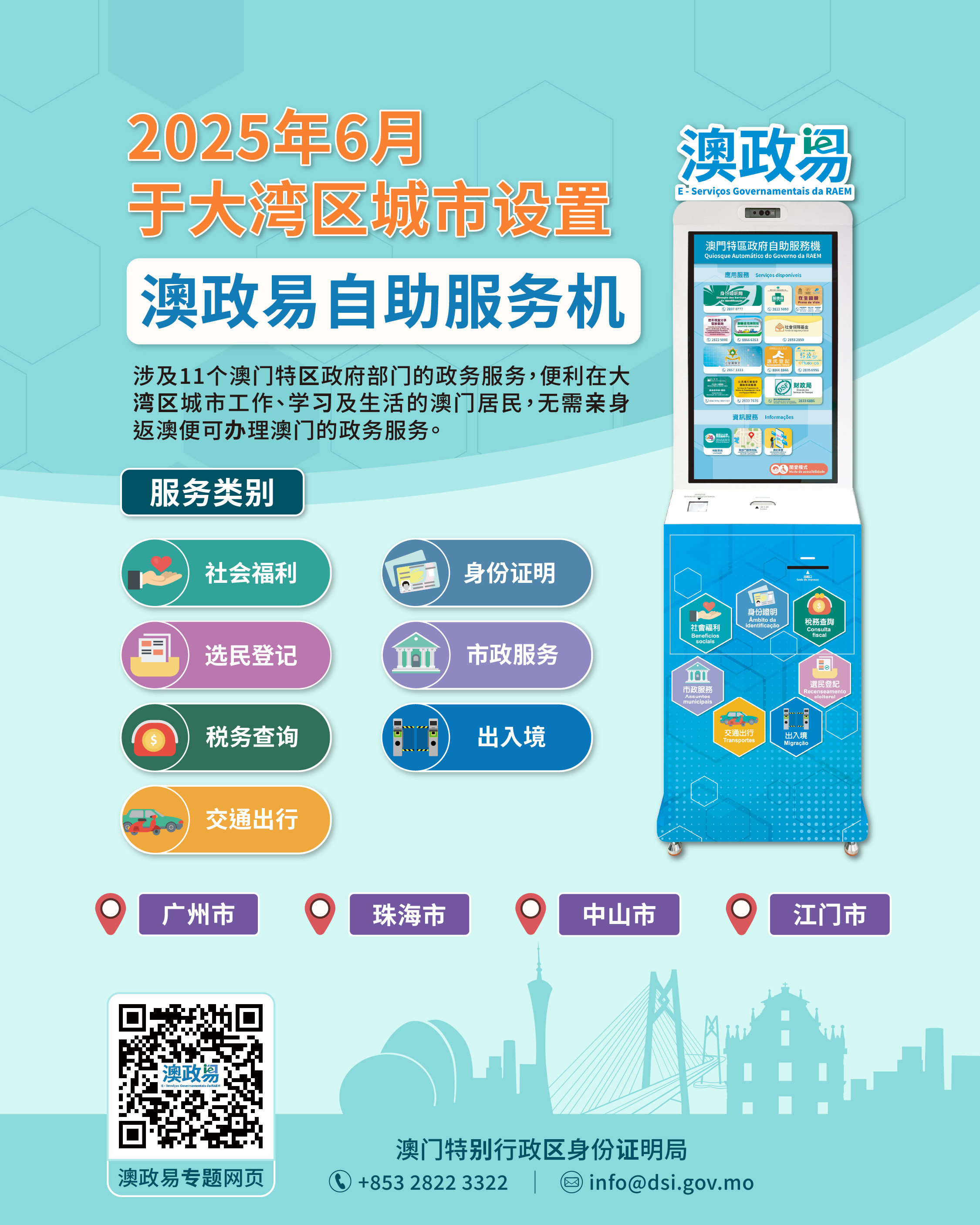 为贯彻落实《粤港澳大湾区发展规划纲要》,澳门特别行政区政府与广东省政府积极协作,以实现高频政务服务事项“跨境通办”为目标,推动两地政务服务深度融合,今(30日)起在四个大湾区内地城市(广州市、珠海市、中山市及江门市)设置澳门特区政府“澳政易”自助服务机,以便利在湾区生活、工作、创业及发展的澳门居民,无需回澳便可办理澳门的政务服务,致力打造大湾区宜业、宜居、宜游的优质生活圈。
