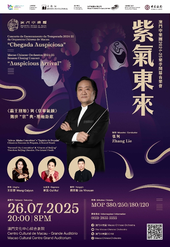 澳门中乐团2024-25乐季闭幕音乐会《紫气东来》将于7月26日(周六)晚上8时在澳门文化中心综合剧院举行。澳门中乐团音乐总监兼首席指挥张列将带领澳门中乐团,联同京胡演奏家王彩云、扬琴演奏家刘音璇及女高音崔蕊,以国乐经典和京剧传奇交织成动人心弦的华彩乐章,为观众呈现音乐名家的绝代风华。