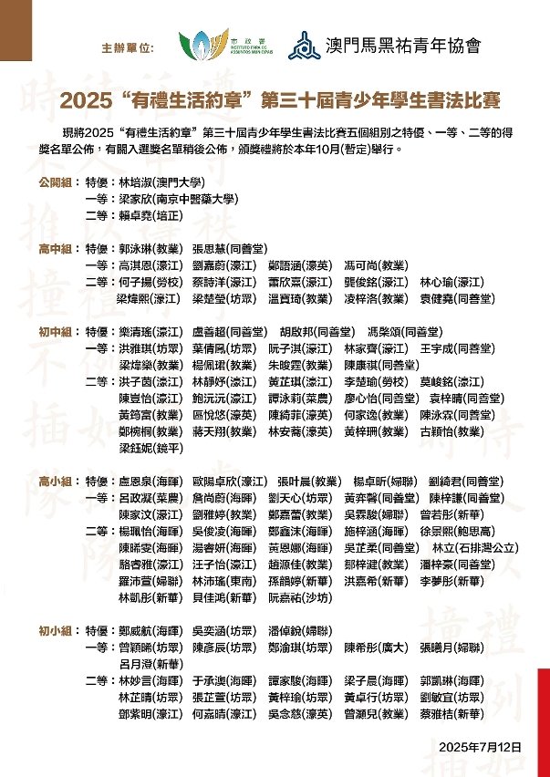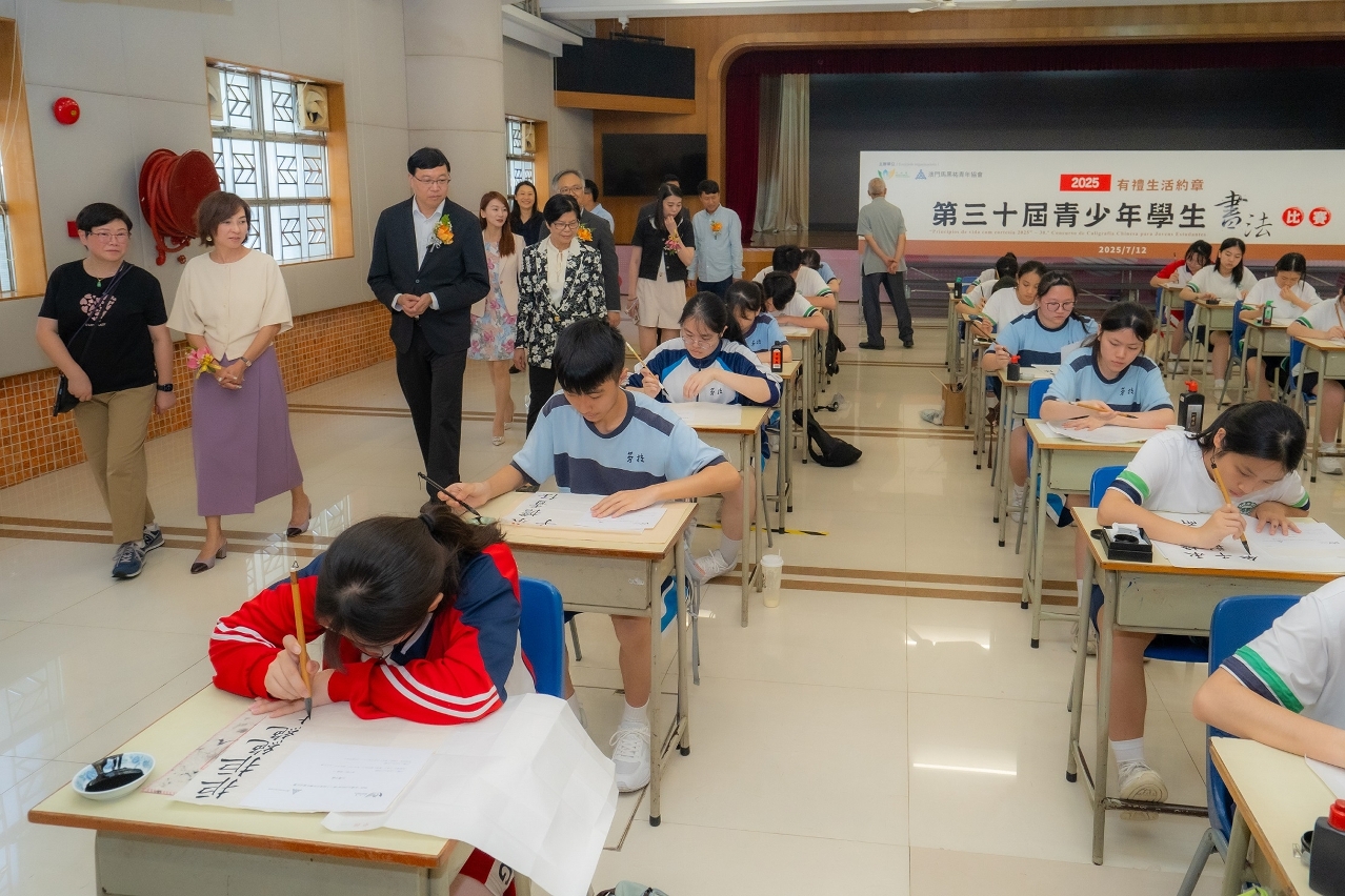 由市政署、澳门马黑佑青年协会举办的“有礼生活约章第三十届青少年学生书法比赛”已于七月十二日在澳门坊众学校(中学部)举行,四十八间本澳学校逾千名学生参赛。今届书法比赛以“有礼生活约章”为主题,推动青少年在日常生活中奉行有礼生活,同时传承中国书法艺术,弘扬中华优秀传统文化。