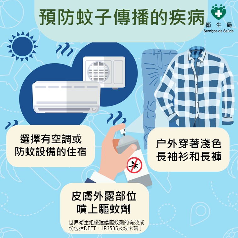 居民如前往热带地区户外或郊区活动时,应加强防蚊措施。建议穿着浅色长袖衣物和长裤,并在裸露的皮肤上使用有效的驱蚊剂,以降低被蚊子叮咬的风险。