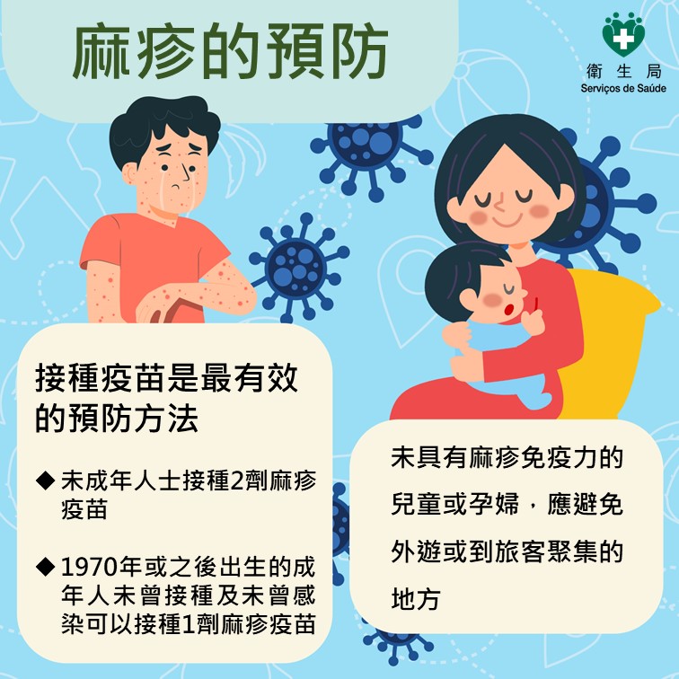 留意当地近期是否有疾病爆发或特殊健康风险,并采取相应预防措施。考虑到全球多地麻疹个案有不同程度上升趋势,卫生局呼吁居民外游前应确保已完成麻疹疫苗接种。由于接种疫苗是预防感染麻疹最有效的方法,未成年人士应在满1岁后至少接种2剂含预防麻疹的疫苗才完全免疫,而在1970年后出生的成年人士如未曾感染过麻疹且未曾在满1岁后接种相关疫苗,应补种1剂。