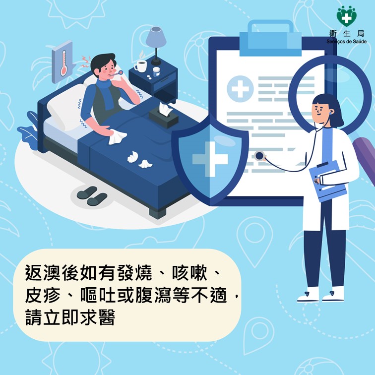 若在旅行期间或回澳后出现发热、发冷、皮疹、咳嗽、腹泻或呕吐等不适症状务必及时就医,并告知医生近期的旅行史以便进行正确诊断和治疗。