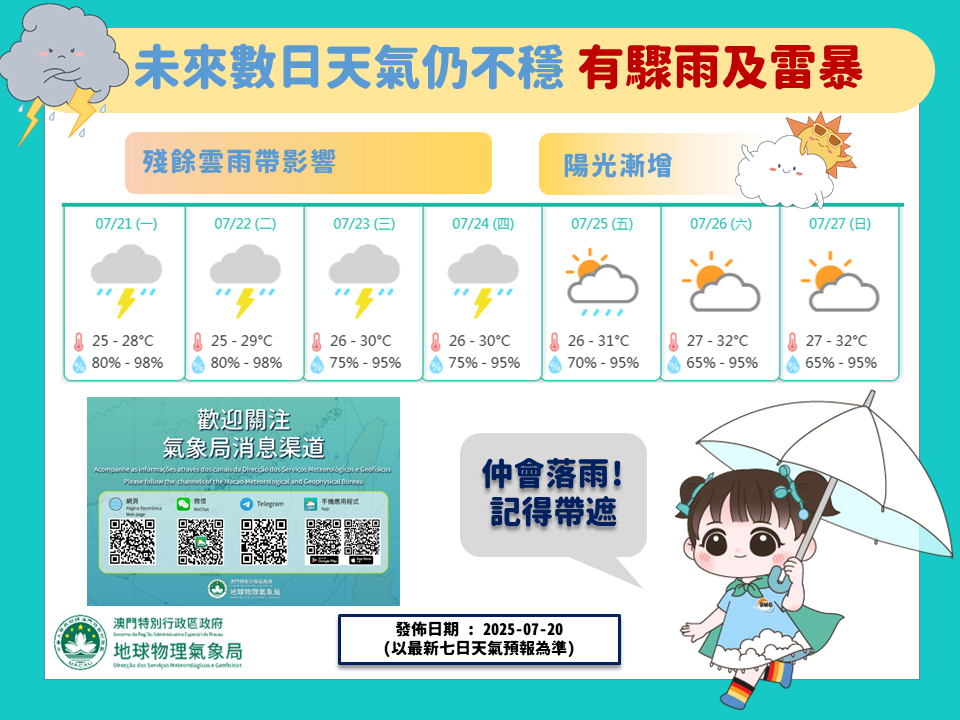 虽然「韦帕」逐渐远离减弱,但受其残余云雨带影响,未来数日天气仍不稳定,会有骤雨及雷暴,展望到本周后期骤雨才会减少,阳光增多,请巿民留意本局最新天气资讯。(图4)