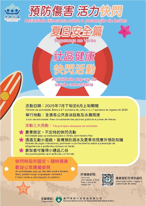 为积极推动“健康社区”计划,提升居民对预防溺水及夏季常见意外伤害的防范意识,普及社区的伤害预防知识,卫生局将于7月下旬至8月上旬期间,在全澳各公共游泳设施及泳滩举办“预防伤害,活力快闪”夏日安全社区健康快闪活动,透过轻松有趣的互动游戏,向公众宣传预防溺水、热伤害及其他夏季高发意外的预防措施,欢迎公众踊跃参与。
