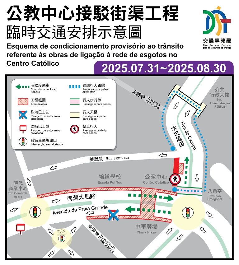 配合南湾大马路近公教中心路段接驳街渠、水管、电缆、管道、天然气管道铺设、道路整治及拆卸临时行人道走廊工程第二阶段施工,经跨部门协调,7月31日至8月30日,南湾大马路及水坑尾街部份路段实施有限度通车,而水坑尾街公教中心对开之行人路则继续禁止通行,由八角亭或南湾大马路往返美丽街和天神巷一带之行人需使用行人天桥(临时交通安排详情请见附表)。