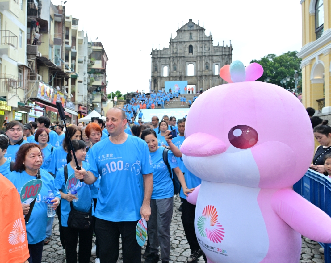 “迎百日健步行”活动率先于下午5时在本澳世遗景点大三巴牌坊前地展开,气氛热烈,展现了澳门市民、旅客对全运会的热切期盼,社会团结一致,携手迎全运的凝聚力。现场志愿者齐心协力拼出寓意深远的数字“100”,象征十五运会正式踏入百日倒数,全城期待十五运会和残特奥会的来临。