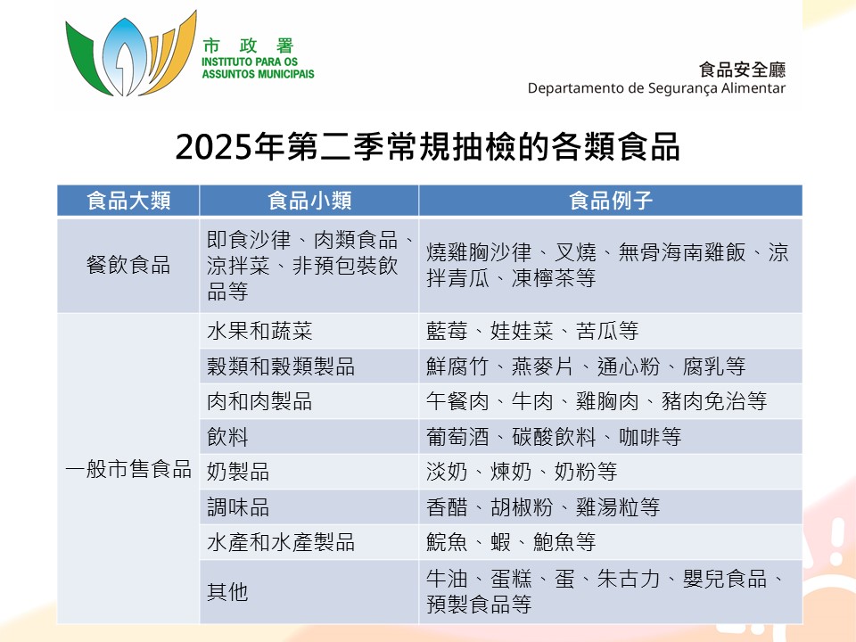 市政署第二季合共抽检八百一十六个食品样本中,包括五百五十九个一般市售食品样本和二百五十七个餐饮食品样本,抽检点涵盖本澳各区食肆、外卖店、熟食中心、超级市场、零售鲜活食品场所及杂货店等。市政署对相关食品样本进行了检测,当中微生物检测项目包括沙门氏菌属、单核细胞增生李斯特氏菌、蜡样芽孢杆菌等常见微生物参数;化学检测项目包括重金属、食品添加剂及禁用物质等;全数样本检测结果均未见异常。