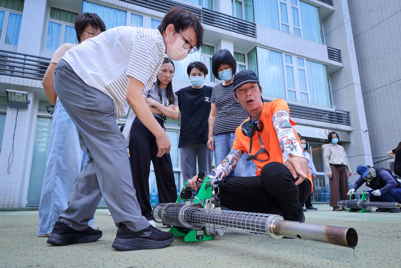 是次培训课程涵盖四个范畴:第一部分是理论知识讲授,介绍蚊媒传染病的流行特性及防控策略;第二部分是灭蚊机器及药物应用专题,包括热雾机、冷雾机的工作原理、适用场景与使用注意事项等;第三部分为防护装备穿戴指导,介绍操作人员安全防护装备;第四部分是灭蚊机器操作流程实训,结合理论讲解与实务操作,由卫生局疾病预防及控制中心的资深专业人员现场示范各类设备的调校、启动、喷洒技巧及维护保养方法等。培训采用小组制教学模式,确保每位学员均有充分的实操机会,专业人员全程指导并即时纠正操作不当之处,通过实境练习确保学员熟练掌握灭蚊技术要领,提升其化学灭蚊的实战能力。
