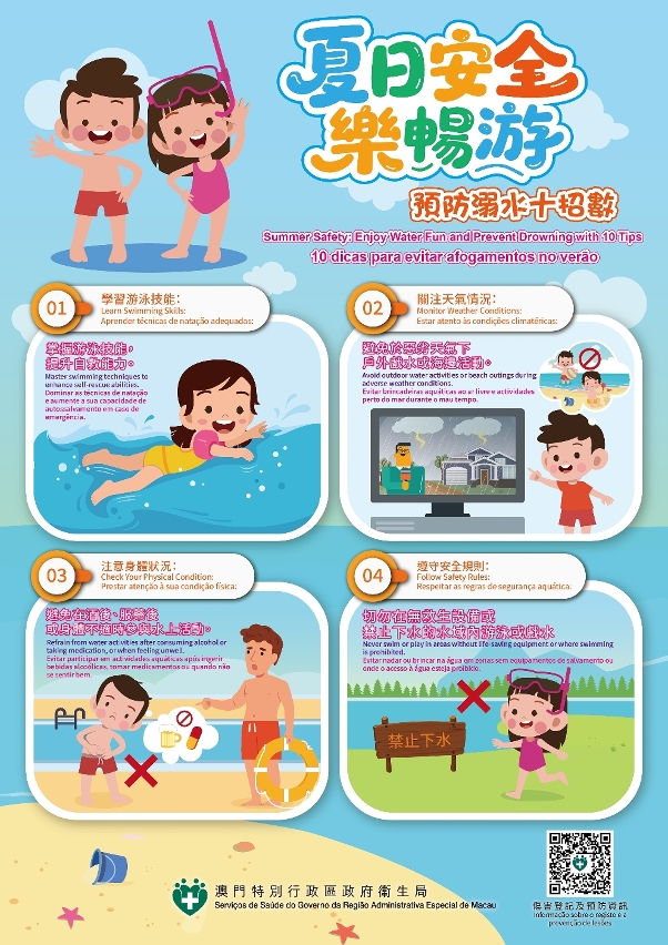 为落实《健康澳门蓝图》各项部署,推动“健康社区”计划,卫生局于7月下旬至8月中旬在全澳多个公共游泳设施及泳滩附近举办“预防伤害,活力快闪”夏日安全社区健康快闪活动,向居民宣导防溺、防中暑及夏季意外预防知识,吸引约2,000人次参与,反应热烈。
