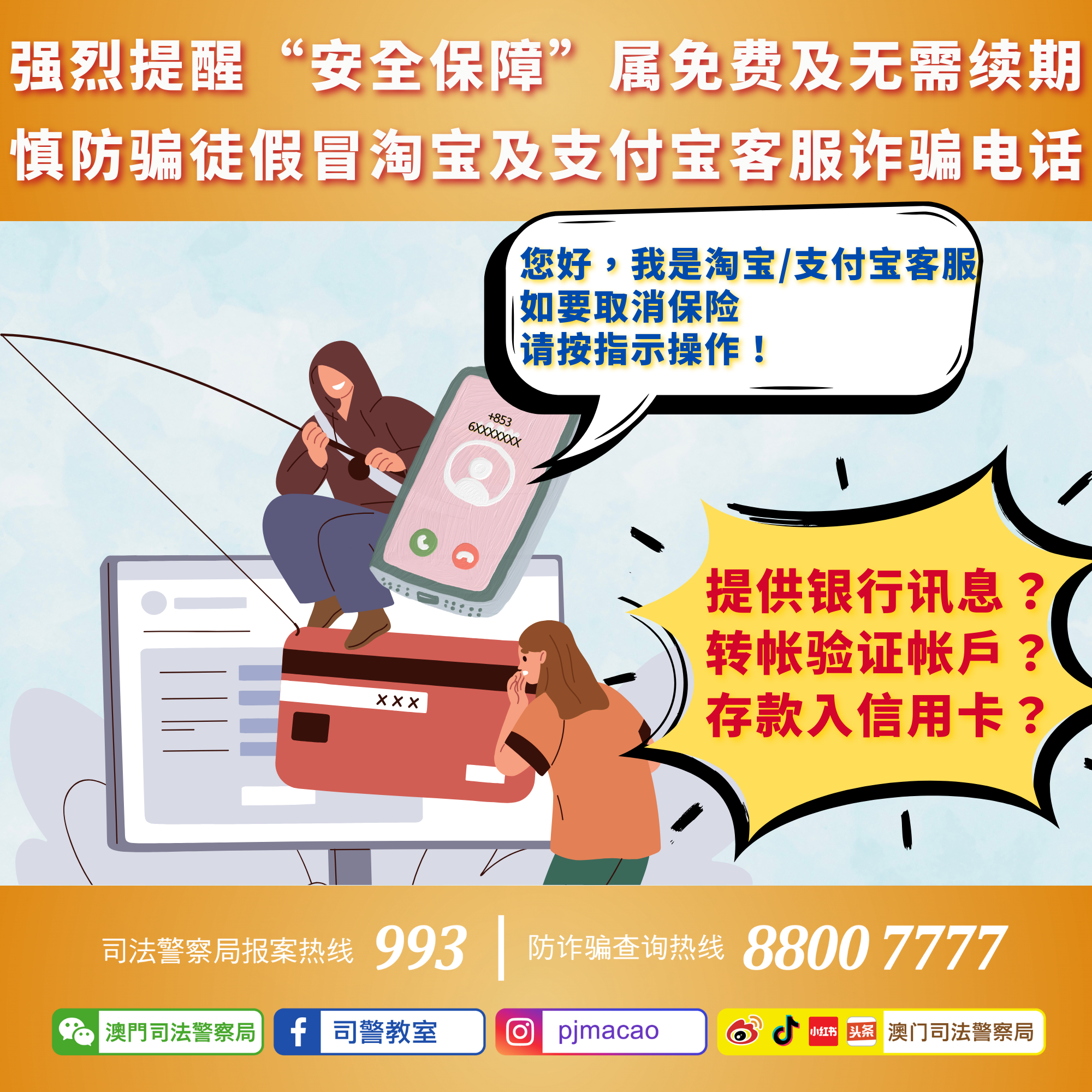 警情通告:强烈提醒“安全保障”属免费及无需续期 慎防骗徒假冒淘宝及支付宝客服诈骗