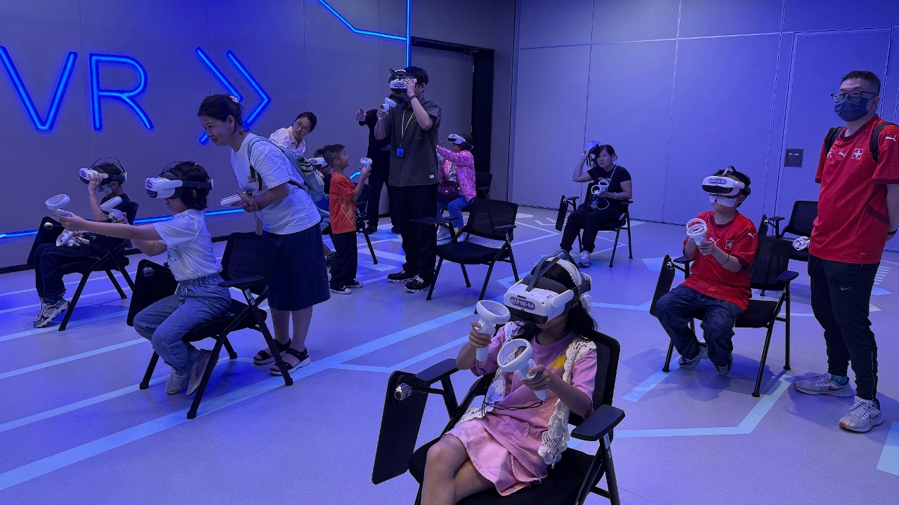 • 亲子们体验澳门基本法纪念馆内的VR普法游戏。