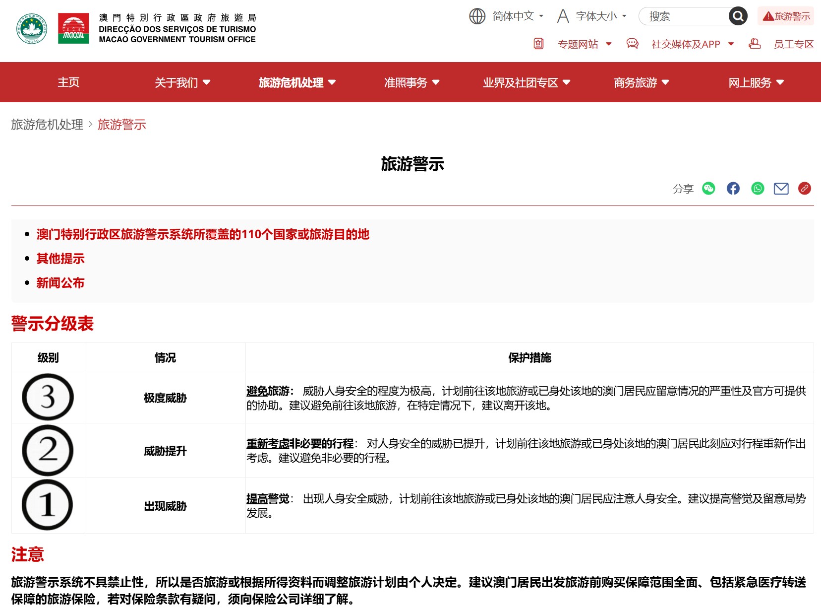 现时,澳门特别行政区制定的旅游警示系统,分为3个不同的级别,有关系统目前所覆盖的110个国家或旅游目的地及现行旅游警示级别的详细资讯,可浏览旅游警示专页:https://www.dst.gov.mo/zh-hant/tourism-crisis-management/tourism-crisis-management-travel-alert.html。