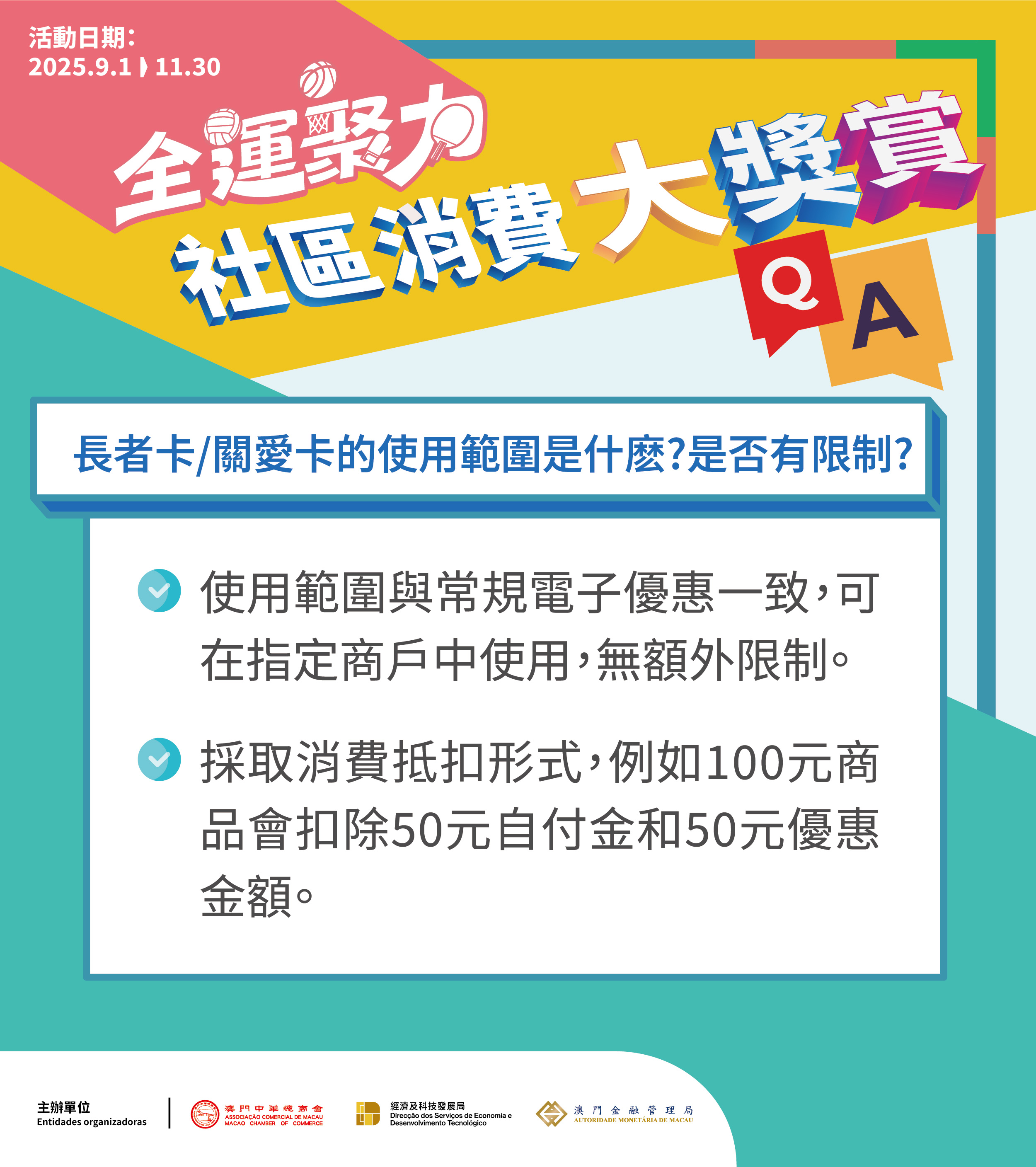主办单位表示,在政府、商会及商户共同努力和配合下,期望延续过去多次活动的成效,透过周一至周五消费后送出电子消费优惠,以及额外提供长者卡及关爱卡的消费立减优惠,进一步增加市民的参与度及获得感;同时鼓励市民在民生区消费,助力完善社区消费循环,既为中小商户改善经营环境,也为整体消费市场稳固信心、注入活力。