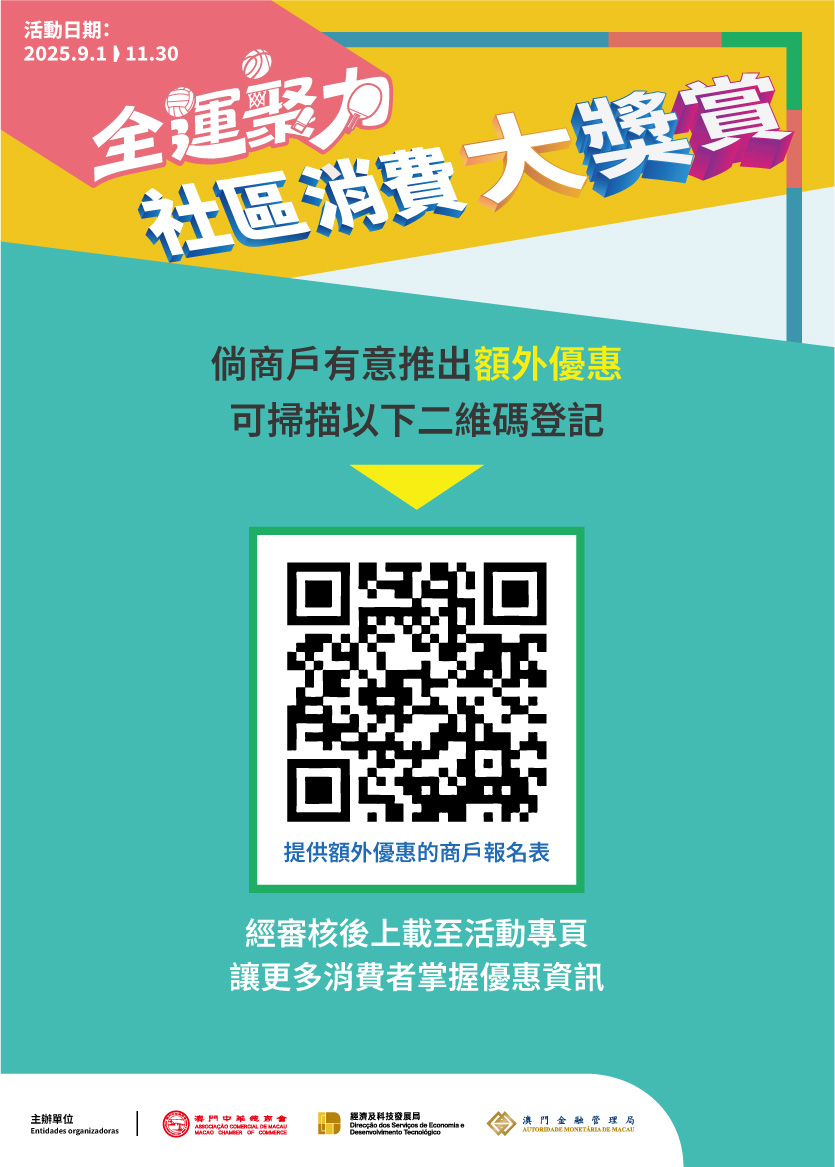 为进一步放大活动效应、助力社区商户经营,特区政府诚邀社区商户积极参与,并同步推出专属迭加优惠,藉此良机提升服务质量与经营水平。目前,提供额外优惠的商户清单已上传至活动专属网页 https://www.macaospendingrewards.com/,且将持续动态更新。倘商户有意推出额外消费优惠,可通过链接 https://jsj.top/f/tGWR52 登记资料,经科局人员核实后将上载至活动专页,方便消费者查询。市民及商户如需了解活动更多详情,可查阅上述活动专页,或在办公时间内致电查询热线2857 5472或2857 5439。