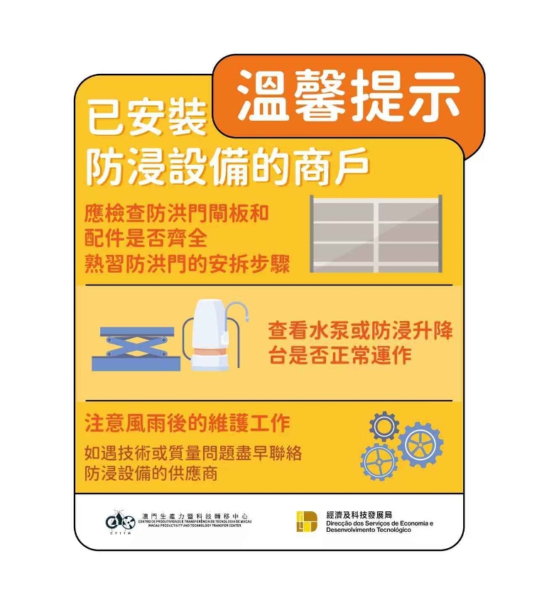 澳门生产力暨科技转移中心与经济及科技发展局呼吁各商户,特别是位处低洼地区的中小企业,密切留意气象部门发布的最新天气情况,按需要及时做好防风防浸的准备工作及预防措施。同时,呼吁已安装防浸设备的商户,检查防洪门闸板和配件是否齐全,熟习防洪门的安拆步骤;已安装防浸升降台和水泵的商户,检查设备是否正常运作。如有疑问,应尽快向所属的工程公司或供应商了解,做好准备,以策万全。