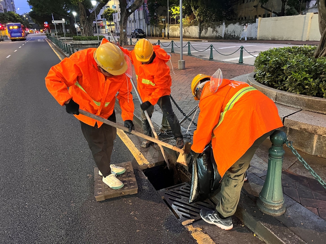 市政署在安全情况下,继续派员巡查及疏通各区渠道,以免堵塞影响排水。