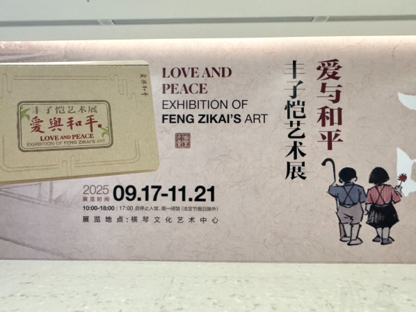 在横琴文化艺术中心举行的“爱与和平——丰子恺艺术展”已正式向公众开放,将持续至11月21日。本次展览精心挑选了丰子恺先生的200件漫画精品,以及其生前所用物品及出版书籍20件,以“家国之情”“诗意之韵”“童真之趣”“护生之心”四大板块多维展示其漫画艺术的诗意、谐趣与哲理,全面呈现其艺术风格与精神内涵。