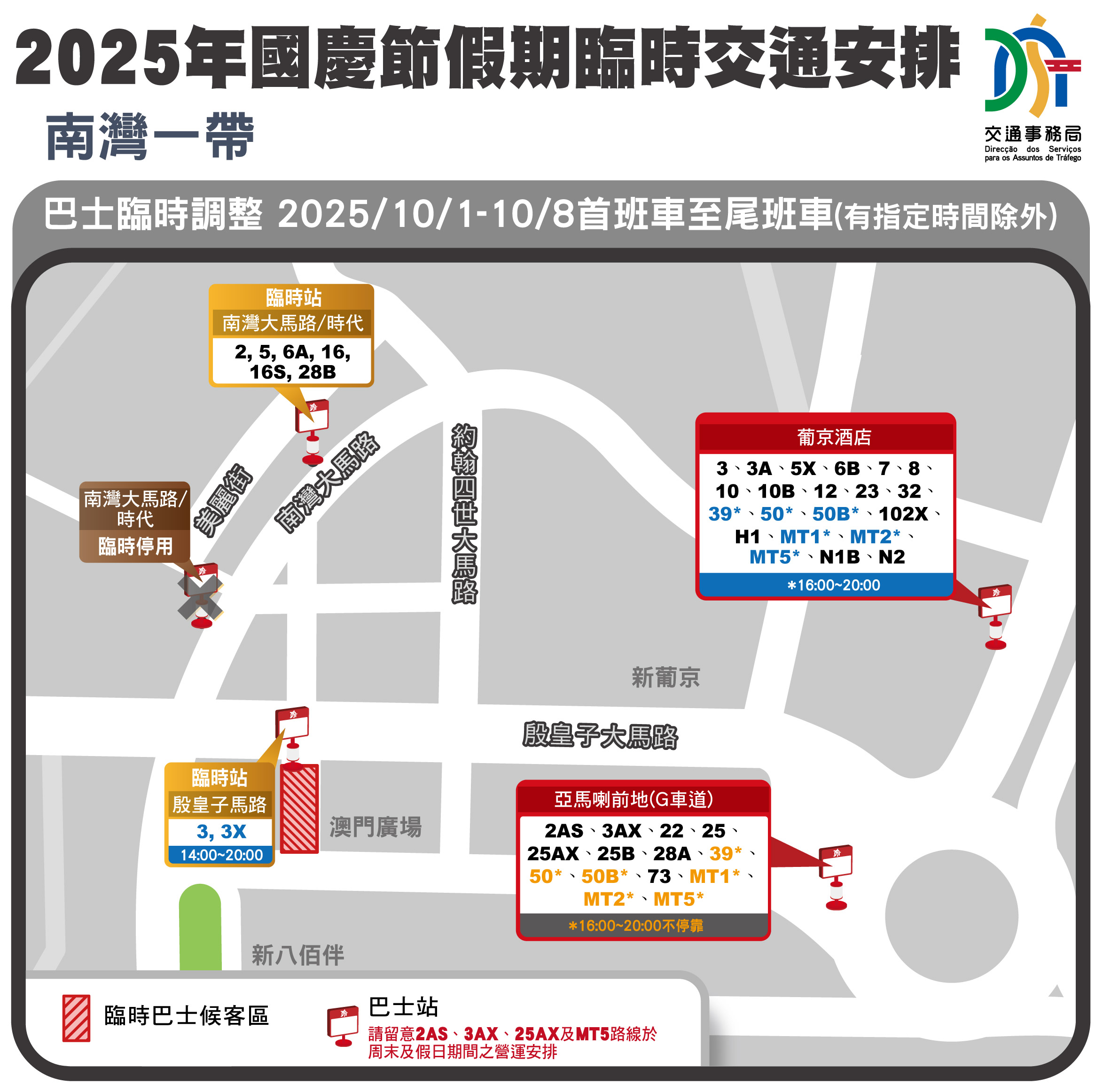巴士服务方面,参考过往重大节假日的运作经验并配合时限性节庆活动,交通事务局除继续维持过往于关闸广场东侧、新马路、南湾、营地大街周边、栢港停车场一带、氹仔旧城区等的临时分流措施外,是次亦会利用栢港停车场地面层辟作临时巴士分流站,于10月1日至8日每日下午4时至晚上8时,分流“十六浦"站的1、3、3X、61及MT4路线,以优化候车空间及交通通行缓冲能力;而为进一步理顺“亚马喇前地"站的候车情况及加强周边道路的疏散能力,于上述同一时段,即10月1日至8日每日下午4时至晚上8时期间,停靠“亚马喇前地"站(G车道)的39、50、50B、MT1、MT2及MT5路线将改为停靠“葡京酒店"站。另一方面,两巴因应客流情况增加班次,会于10月1日至8日期间临时营运时节性及特班车路线3BX、17T、21AT、26AT及101X特班车(101XS),以增强运力、加快乘客疏运。周边相关道路将同步实施临时交通管制,具体巴士调整详情可参阅附表或浏览两巴网站(澳巴:www.tcm.com.mo,新福利:www.transmac.com.mo)。