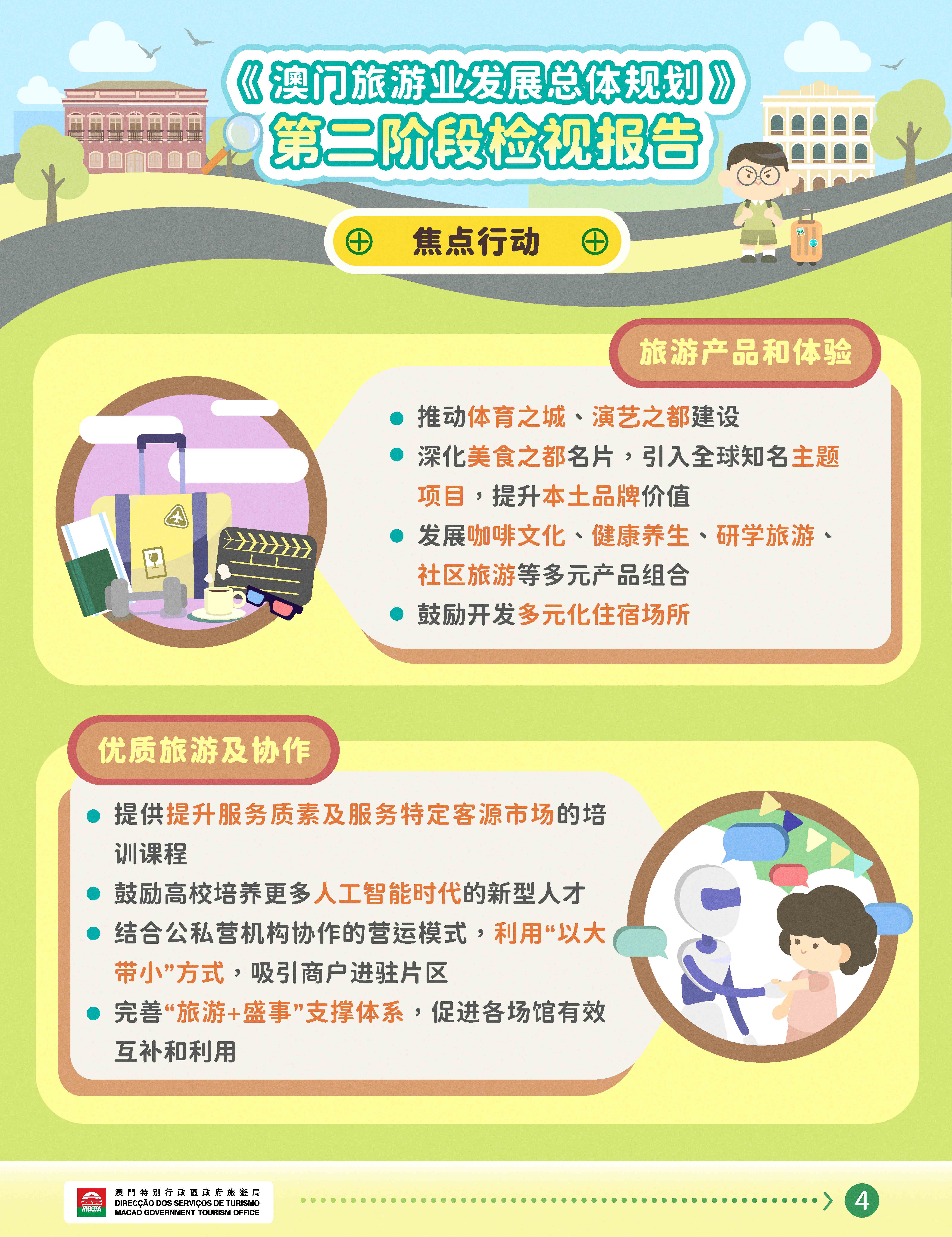 当中焦点行动包括发展多元产品组合,引入全球知名主题项目,提升本土品牌价值;提供针对特定客源市场的培训课程,培养人工智能时代的新型人才;开展针对性的线上线下营销推广,发展联程旅游产品;拓展潜力旅游发展空间,提升机场及口岸的接待能力;运用智慧科技提升旅客体验,协助中小企业提升服务能力;加强与横琴及粤港澳大湾区城市深度旅游合作,促进国际交流等。