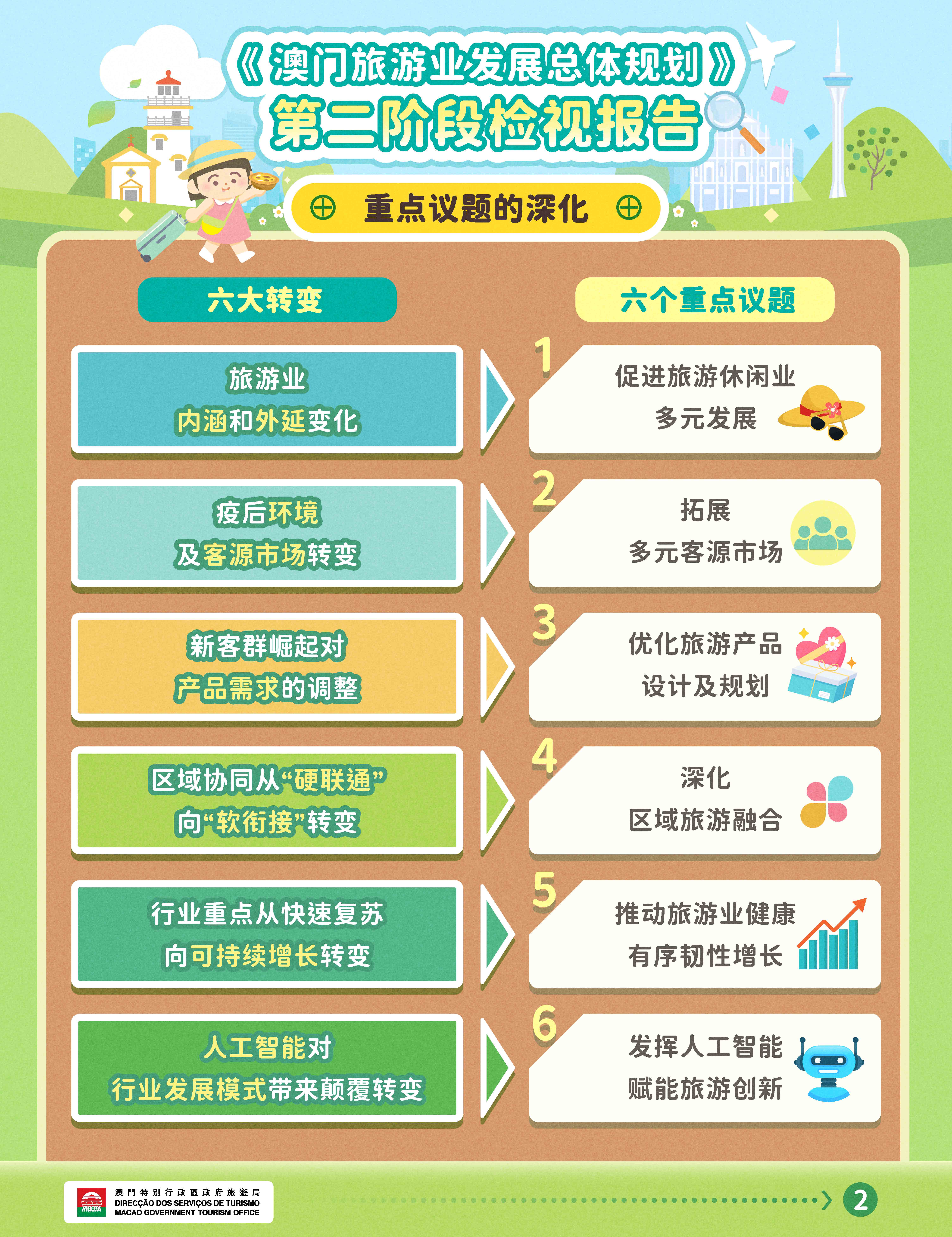 《总体规划》第二阶段检视研究内容主要包括:回顾2021至2024年的执行情况,并修订2025至2030年的行动计划及关键指标;分析澳门旅游业发展状况与趋势;重点深化六大议题:促进旅游休闲业多元发展、拓展多元客源市场、旅游产品设计及规划、深化区域旅游融合、旅游业健康有序韧性增长及人工智能赋能旅游创新。