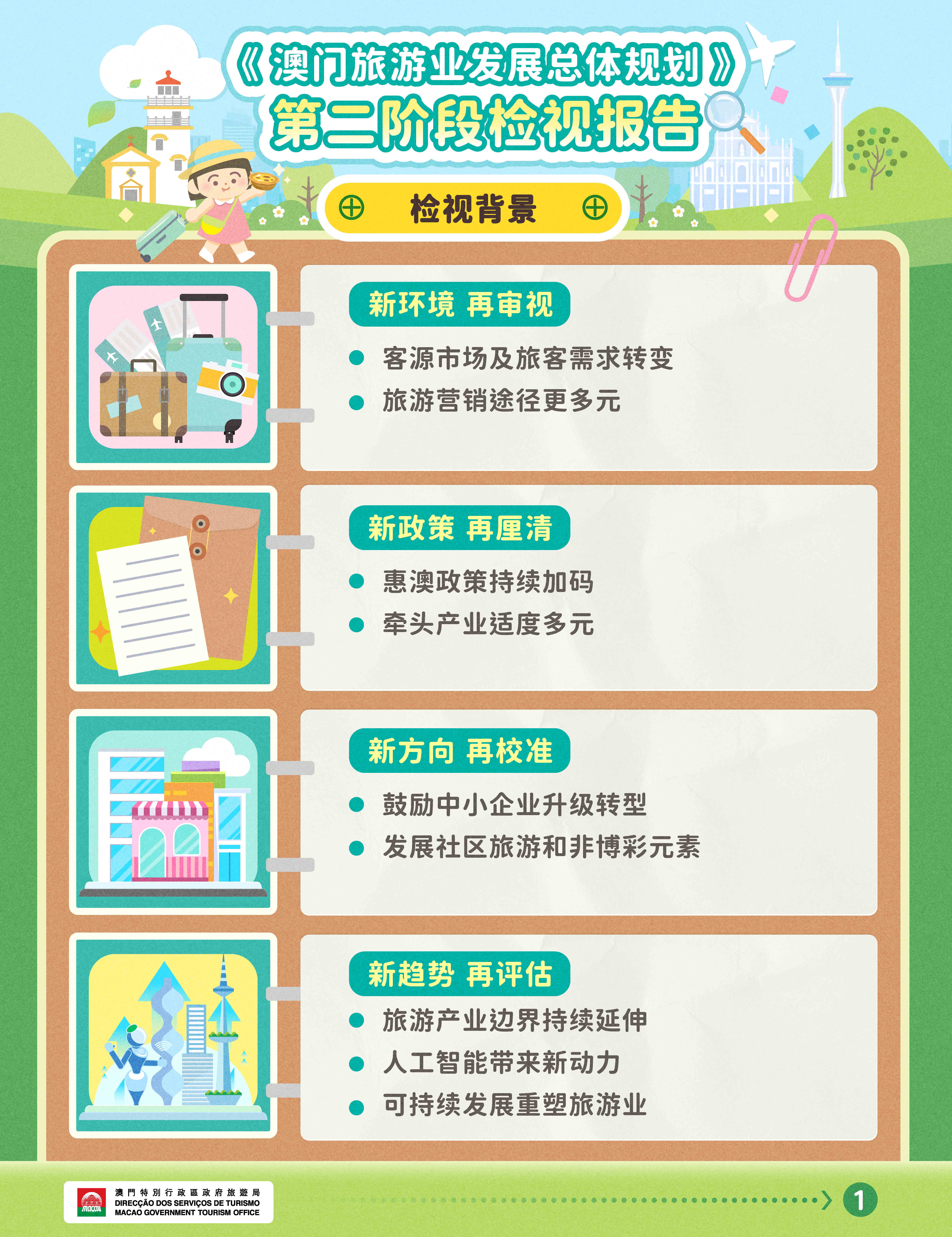 随着全球旅游市场加速复苏,澳门旅游业迎来全新发展环境,加上近年国家和澳门特区相继出台多项支持政策,面对旅游业新趋势,需进一步明确发展新方向与实施路径,以推动澳门旅游业实现高质量发展,为此,旅游局于2024年委托研究机构进行《澳门旅游业发展总体规划》(以下简称《总体规划》)第二阶段检视。