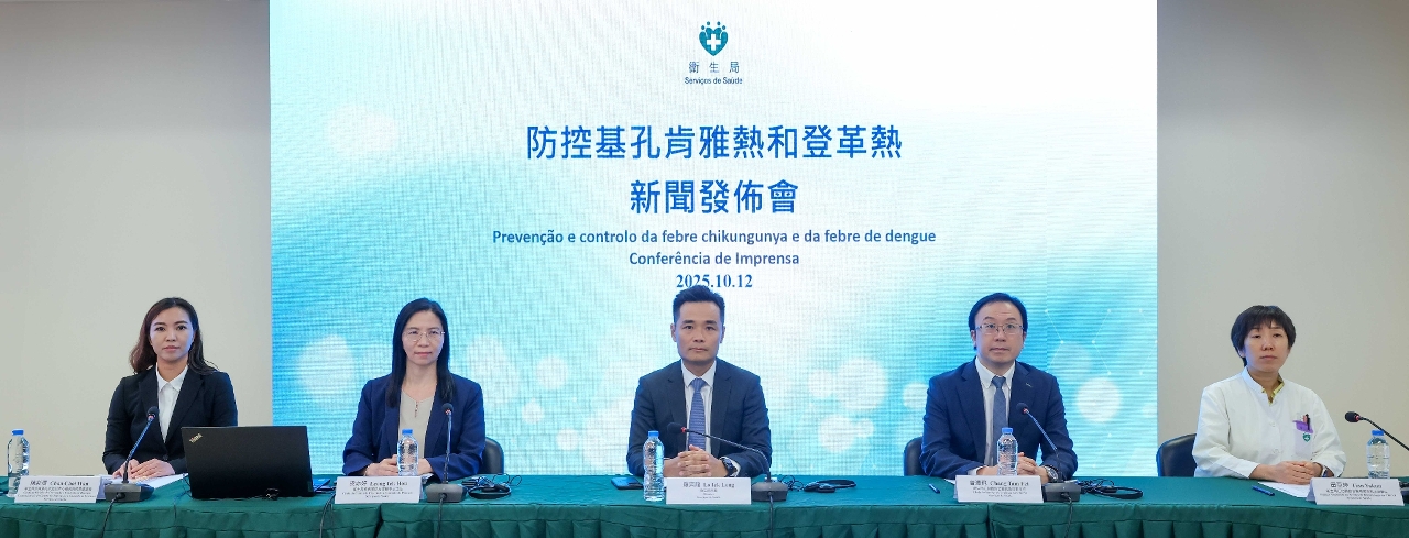 为了及早让居民了解特区政府应对基孔肯雅热和登革热(下称:双热)的总体防控策略和具体执行措施,以及希望居民配合行动提高警惕性,并积极配合特区政府防蚊、灭蚊和早期发现病例等工作,卫生局今(12)日举行新闻发布会,介绍现时本澳防控基孔肯雅热和登革热流行情况和防控措施。卫生局罗奕龙局长、疾病预防及控制中心梁亦好主任 、仁伯爵综合医院曾潭飞医务主任、疾病预防及控制中心传染病防控处陈彩环处长、仁伯爵综合医院感染科田亚坤主治医生出席了新闻发布会。