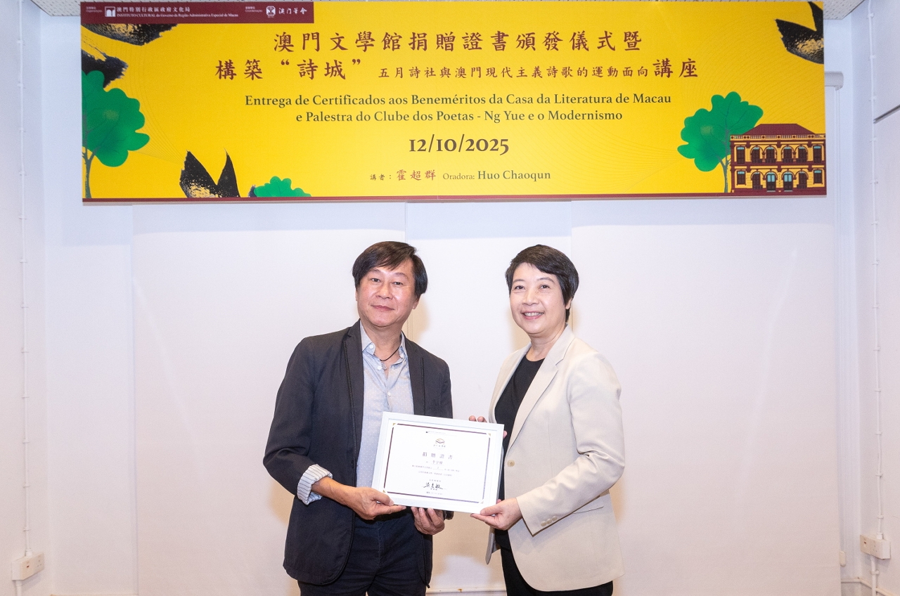 文化局持续深化澳门与大湾区城市的文化交流,搭建更广阔的创作与展演平台,推动文学、戏剧及文化表演的跨界融合,颁赠仪式当日同时举办“构筑‘诗城’——五月诗社与澳门现代主义诗歌的运动面向”讲座,由澳门科技大学国际学院讲师霍超群主讲,吸引众多市民参与,反应热烈。霍超群在讲座中聚焦五月诗社如何在多元文化背景下,融合不同诗意追求,构筑独特的“诗城”文学理想;探讨诗社成员在“鼓励创作”与“追求先锋”之间的辩证关系,以及他们如何回应澳门城市现代性带来的文化命题。