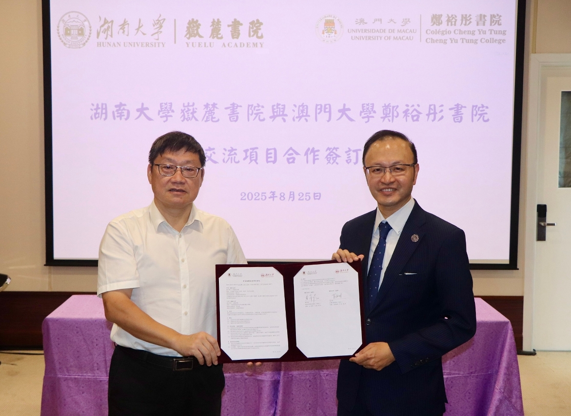 澳门大学郑裕彤书院迎来湖南大学岳麓书院的回访,期间签署了“学生短期交流项目协议”,双方每年将互派学生进行短期交流学习。