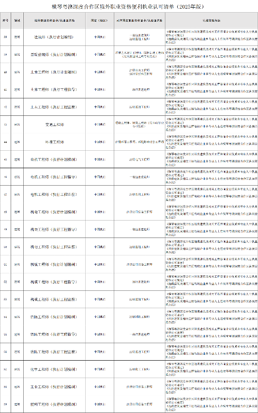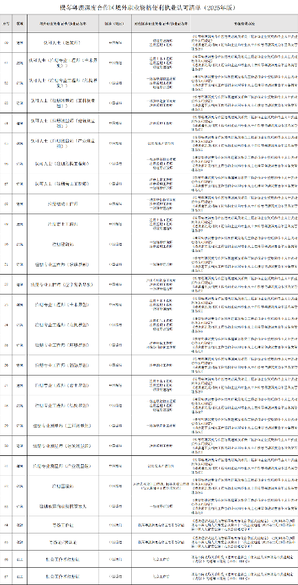 《清单》涵盖法律、金融、会计、税务、药学、医疗卫生、建筑、规划、旅游、社工10个领域,包括律师、证券从业人员、会计师、税务师、土木工程师等87项职业资格,其中有49项为澳门职业资格,进一步拓宽了澳门专业人士在合作区的执业空间。