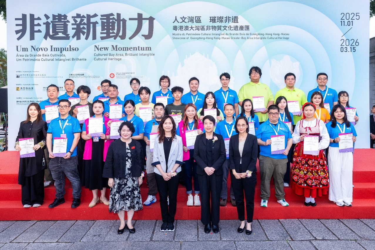 开幕式同场举行“澳门非物质文化遗产新生代研培计划2025”结业典礼。研培计划为粤港澳文化合作项目,旨在提升本澳非遗传承群体的专业能力,启发其非遗产业化思维,推动学员成为澳门非遗传承与创新的中坚力量。30名学员先后在澳门、广州及香港进行理论研习和实地考察,并与粤港非遗传承人交流传承与创新的经验,他们亦将参与是次活动的技艺展演,展示学习成果。学员们获三地嘉宾颁发证书,多名非遗传承人及学员的师父到场见证祝贺。