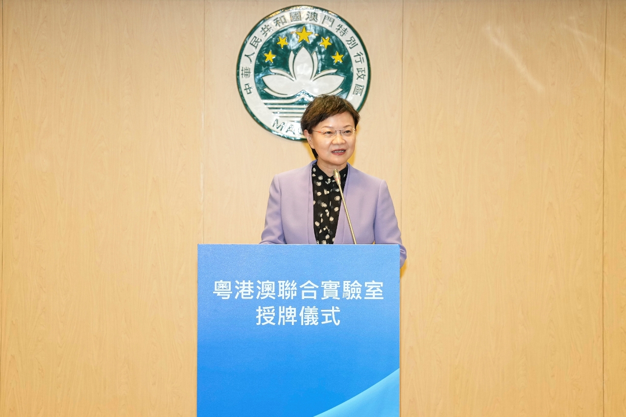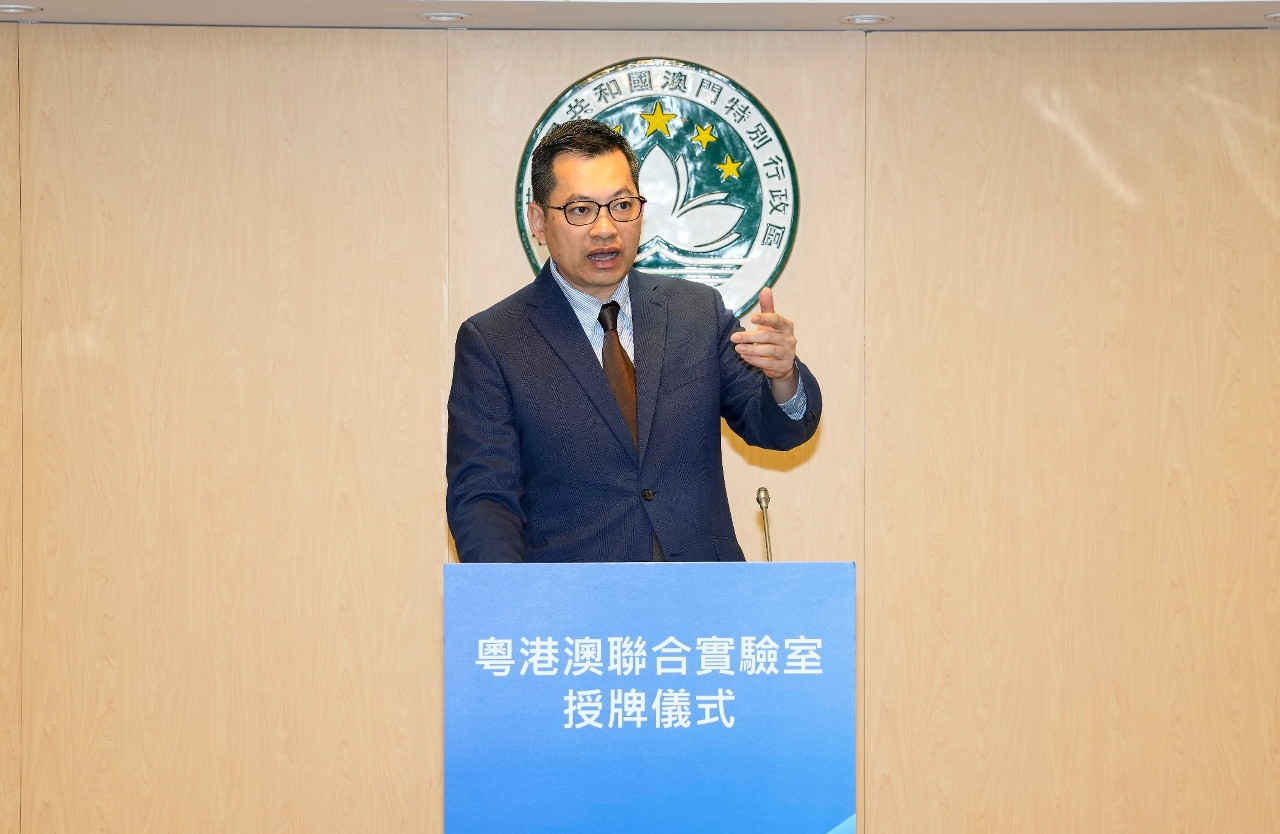 “粤港澳联合实验室授牌仪式”昨(4)日在澳门举行。澳门科学技术发展基金(下称“科技基金”)行政委员会主席余雨生和广东省科学技术厅厅长王月琴出席仪式,并向获批设立的两所粤港澳联合实验室正式授牌。中央政府驻澳门联络办公室经济部代表张冠宇、澳门大学校长宋永华、澳门科技大学校长李行伟、经济及科技发展局局长邱润华、教育及青年发展局副局长丁少雄、药物监督管理局副局长李世恩、邮电局行政委员会委员杨富荣、珠海市科技创新局局长黄南荫、横琴粤澳深度合作区经济发展局副局长黄中坚等多位嘉宾共同出席见证。