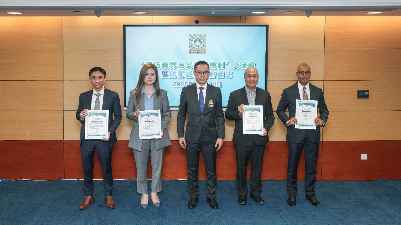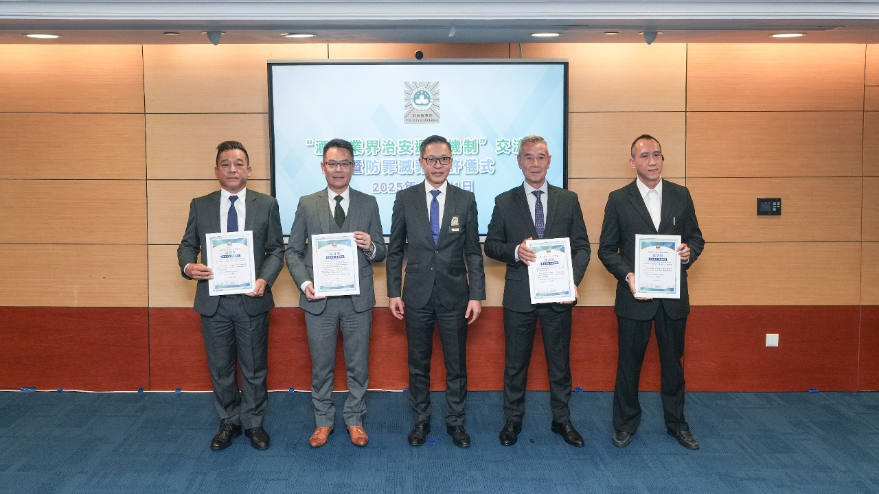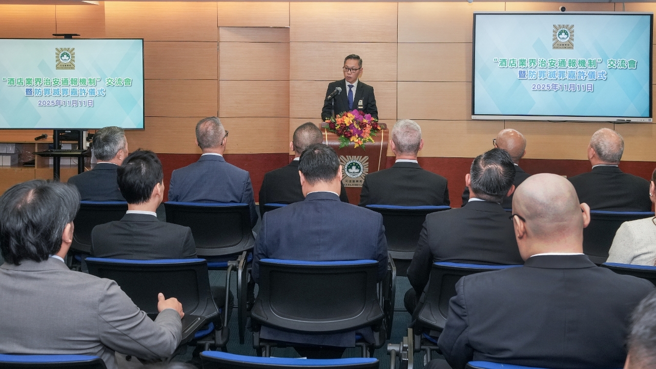司法警察局举行“酒店业界治安通报机制”交流会,与本澳休闲企业及酒店业界代表共商优化合作机制,加强预防和打击酒店及周边区域的罪案与违法活动,以更有效维护社会治安秩序,保障市民和旅客安全,并持续提升澳门作为旅游城市的良好形象。会上同时进行“防罪灭罪嘉许仪式”,8间休闲企业及酒店因在过去一年积极协助司警局警务工作获颁嘉许状。