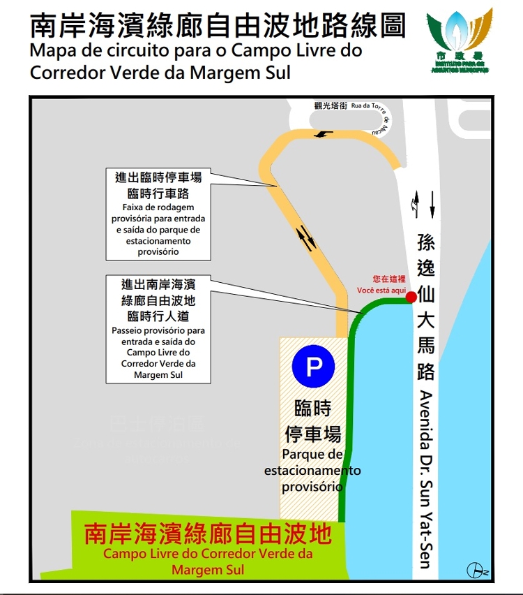 由于南岸海滨绿廊二期整体工程尚未完成,为方便公众使用一区设施,经交通事务局协调及考虑周边的交通环境,于一区旁设置了可停泊110辆汽车及约100辆电单车的临时停车场,车辆可经观光塔街进出,行人亦可经设于孙逸仙大马路的临时行人道出入。