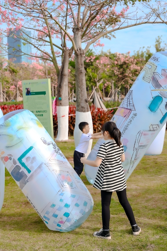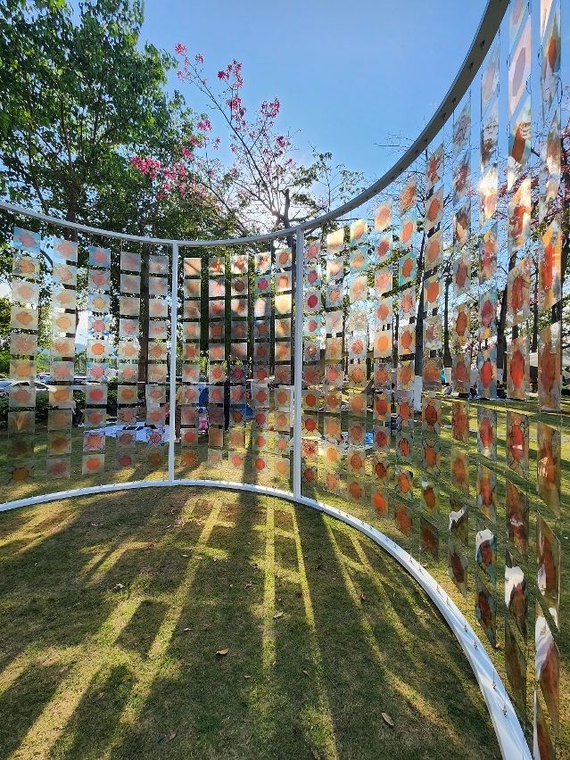 来自澳门的青年艺术家黎小杰、卢绍仪共同打造的艺术装置在现场亮相,成为市民游客争相打卡的焦点。该作品以自然花卉为灵感,融合当代艺术装置与传统工艺,寓意“以艺为桥,以乐为心”。黎小杰、卢绍仪等在现场与市民交流创作理念,鼓励公众参与艺术创作,真正实现“人人都是艺术家”的共创体验。