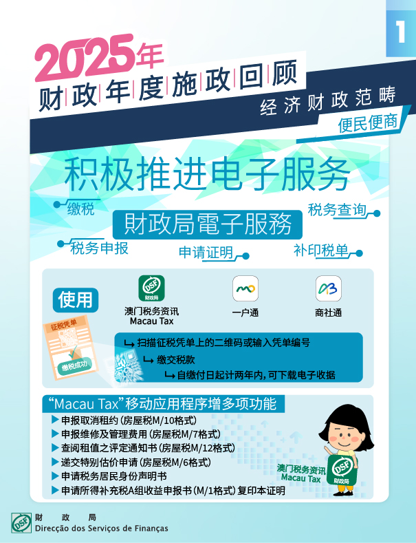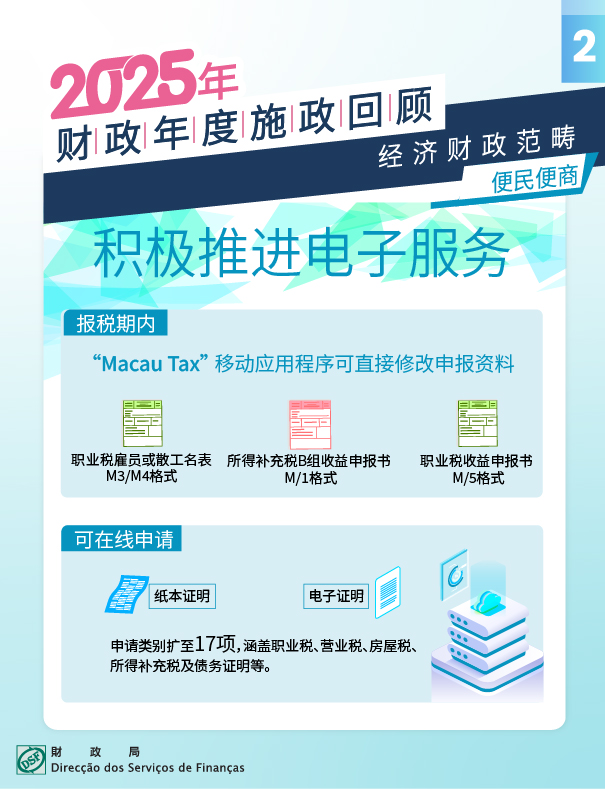 为落实2025年施政报告提出参与推动电子政务,研究推出更多电子服务及便民措施等工作目标,财政局正持续优化相关服务的电子化程度,希望达致便民便商。目前,财政局于各平台的电子服务涵盖税务查询、申报、缴纳、申请证明及补印税单等。