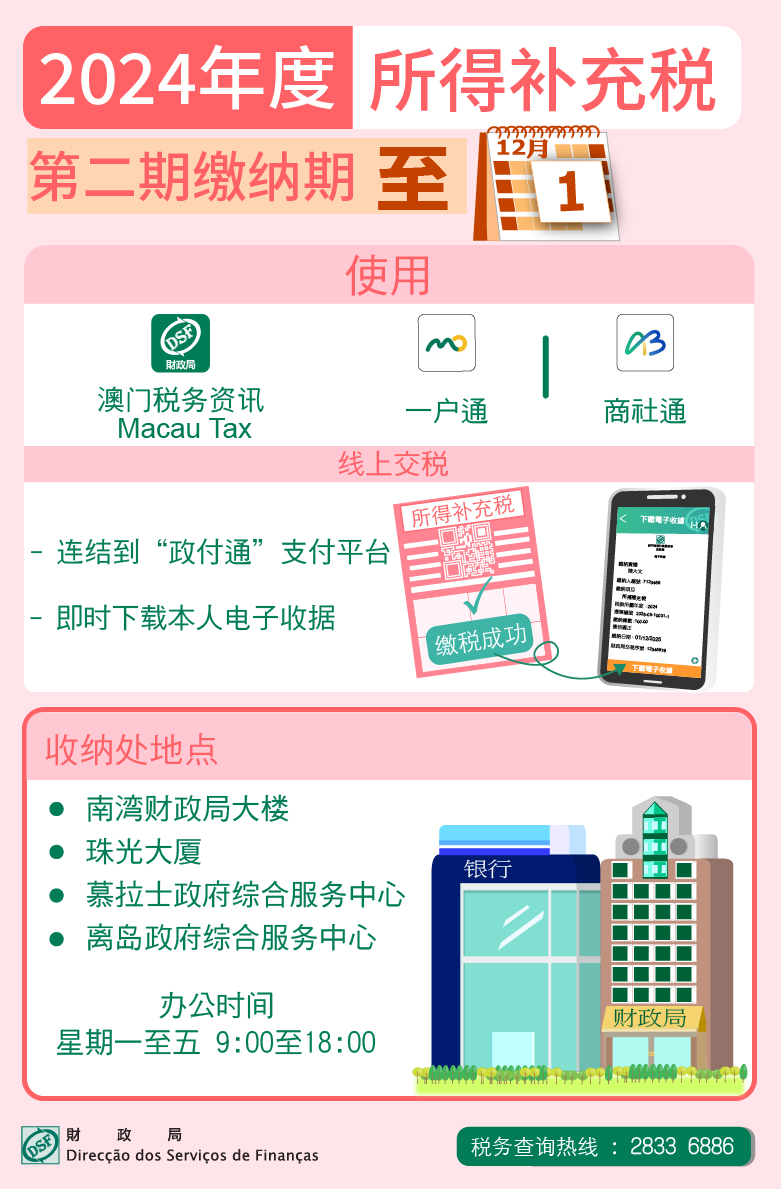 财政局提醒所得补充税纳税人,缴纳月份为11月之第二期所得补充税,最后缴纳期限至12月1日。为免因逾期缴纳而附加过期利息及罚款,仍未缴纳上述税款之纳税人须尽快缴纳。