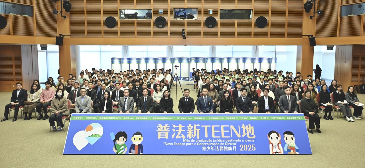 为持续向青少年推广法律知识,增强青少年知法和守法意识,“青年政策”跨部门跟进小组成员(法务局、市政署、经济及科技发展局、劳工事务局、警察总局、治安警察局、司法警察局、教育及青年发展局、文化局、体育局、卫生局、社会工作局、环境保护局),连同今年首次参与的消费者委员会,共14个政府部门于2025年9月至11月合办了“普法新TEEN地”青少年法律推广月。本年组织了多项普法专题活动,活动形式包括:法律讲座、线上问答游戏、嘉年华、法制课程、校园巡回讲座、巡回展板展览、写作奖励计划及宣传推广活动等,其中继续举办本地普法推广活动及到访横琴的社会体验活动。共约137,423人次参加有关活动,活动的参加对象为澳门高等院校在读的本科学生和非高等教育学生。
