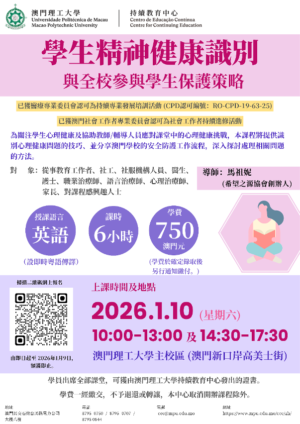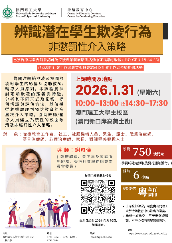 为助力提升对青少年的关爱氛围,加强校园和社区的辅导支援力度,澳门理工大学持续教育中心将于 2026年1月开办两项培养青少年实务课程 —“学生精神健康识别与全校参与学生保护策略”及“辨识潜在学生欺凌行为与非惩罚性介入策略”课程,导师为港澳资深社会工作专家。课程分别获澳门医疗专业委员会及社会工作者专业委员会认可为持续专业发展(CPD)培训活动,欢迎教育工作者、社工、社服机构人员、医护人员、治疗师、相关专业人士及对课程感兴趣人士报读。