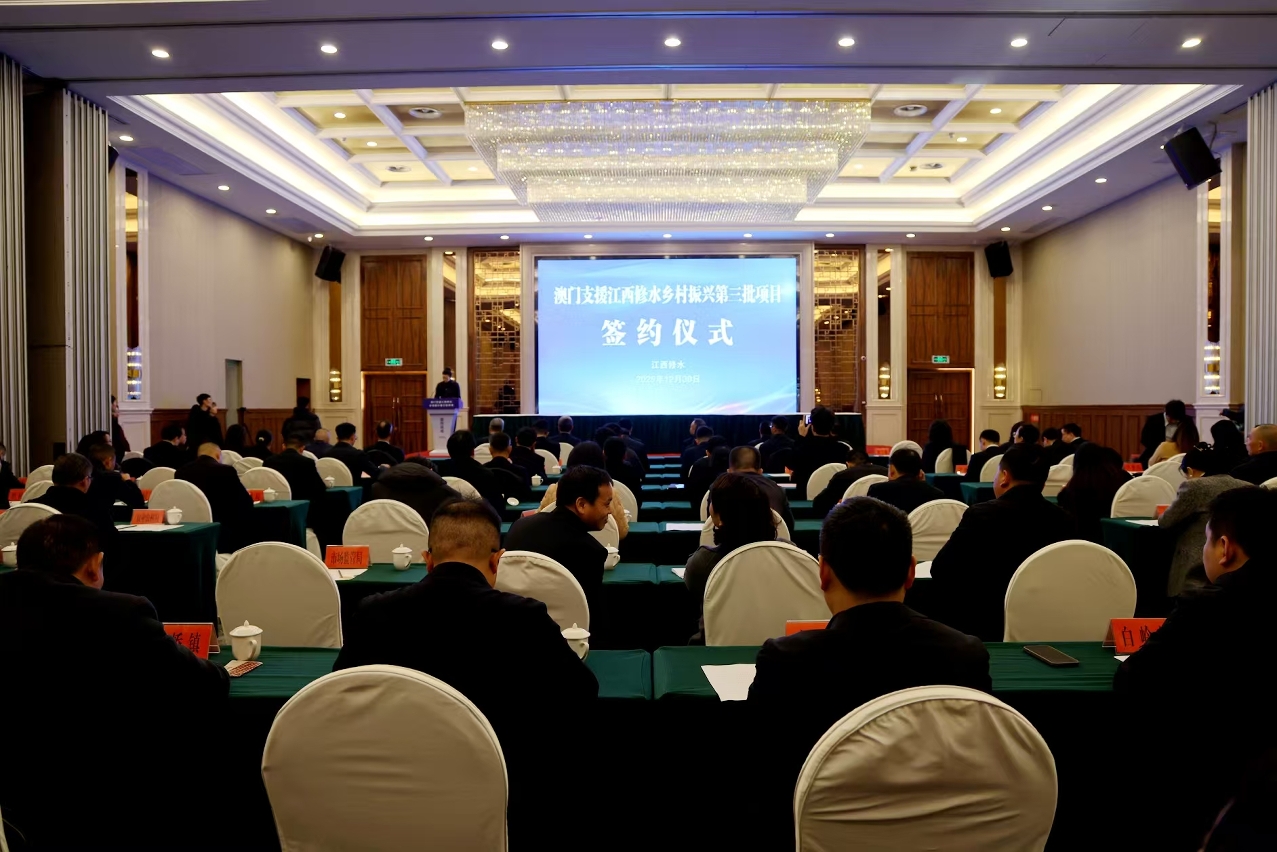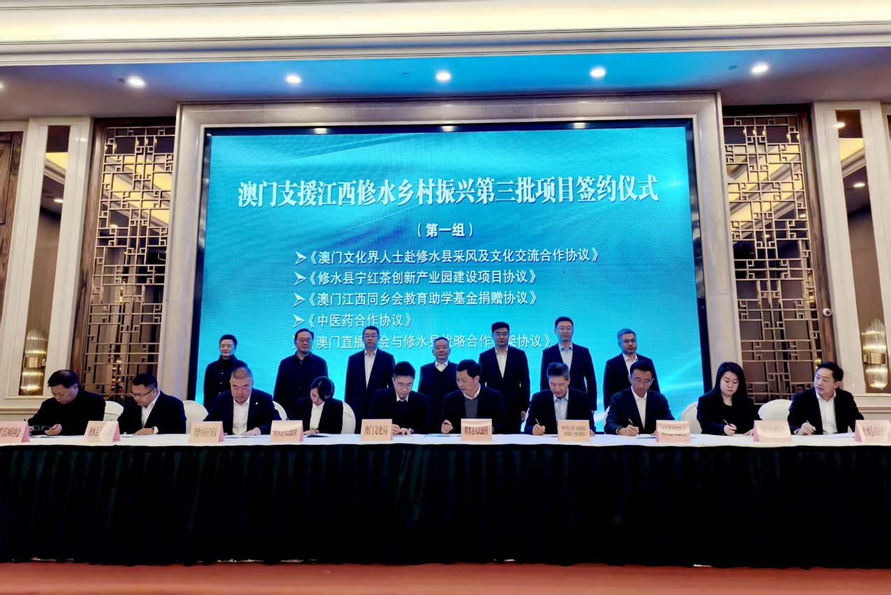 2025年12月30日上午,澳门支援江西修水乡村振兴第三批项目签约仪式举行。澳门特别行政区政府政策研究和区域发展局局长张作文,中央人民政府驻澳门特别行政区联络办公室经济金融部副部长杨全州,江西省苏区办副主任傅小鹏,江西省港澳办副主任陈俊,九江市政府副市长杜少华,修水县委书记郑庆华,修水县委副书记、县长刘婕出席,出席签约仪式的还有澳门特区政府政策研究和区域发展局、澳门中联办经济金融部、澳门特区政府文化局、澳门蔬菜批发商商会、澳门直播协会、澳门江西同乡会、澳门记者联会、澳门部分优秀企业和省发改委、省港澳办等单位有关领导和嘉宾。签约仪式由刘婕主持。